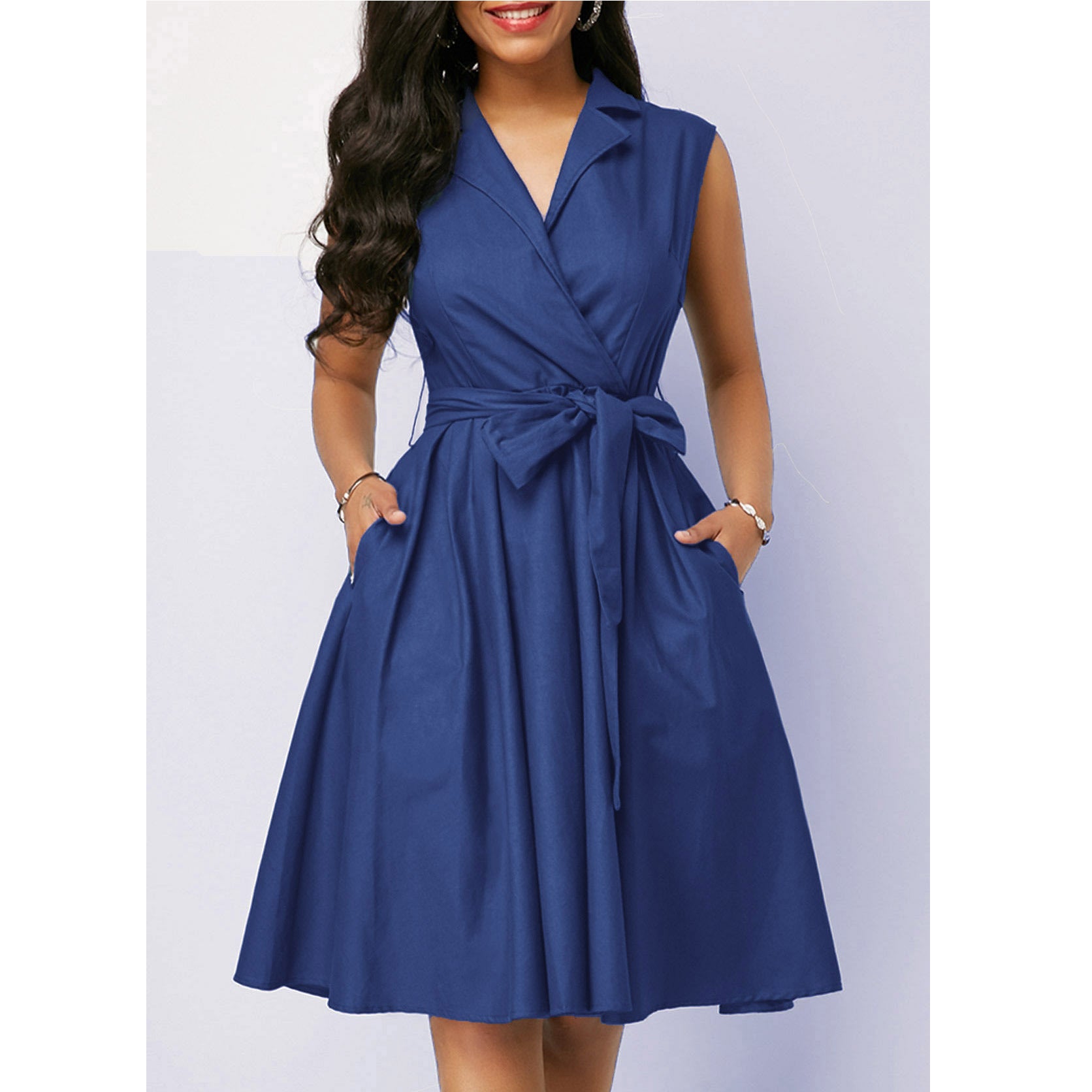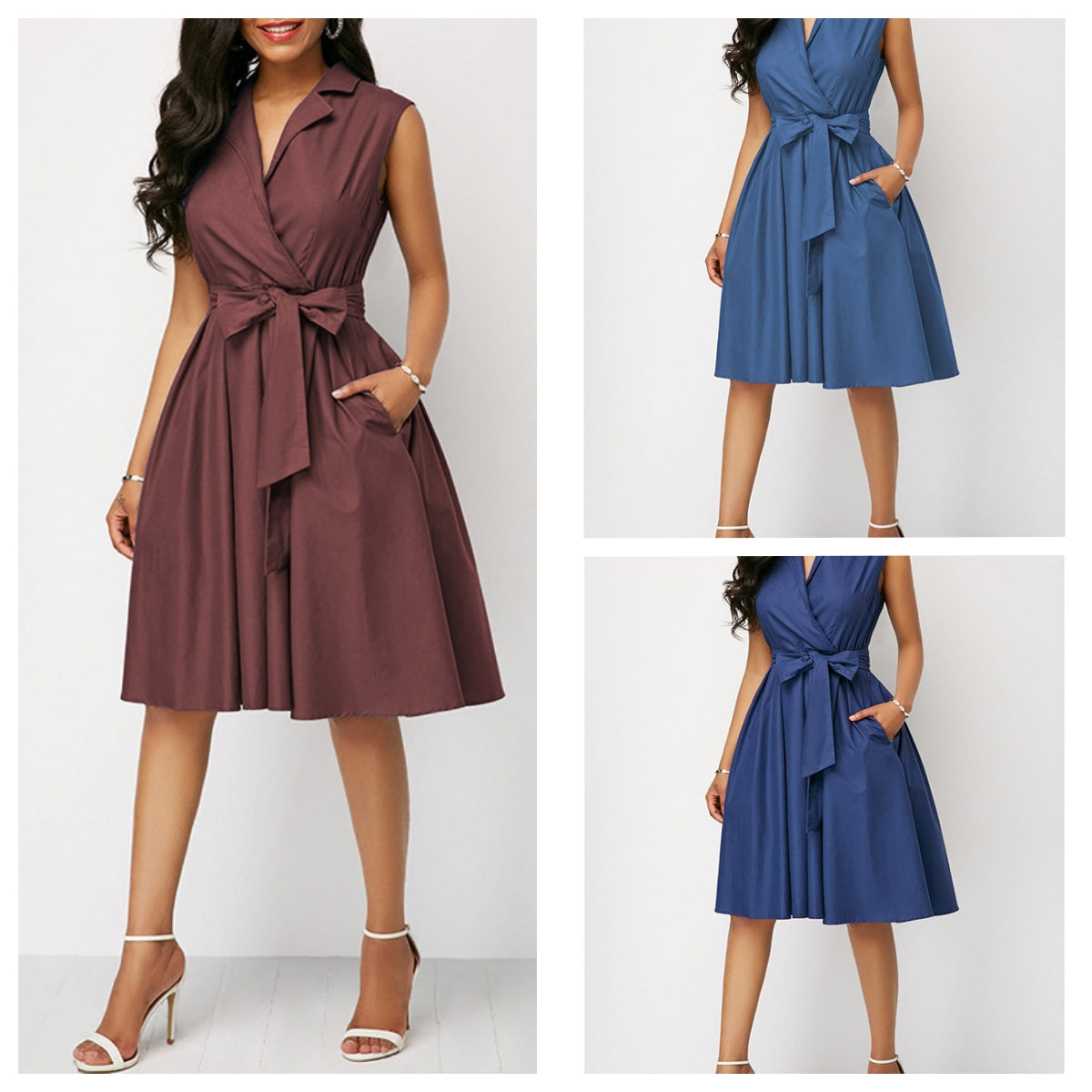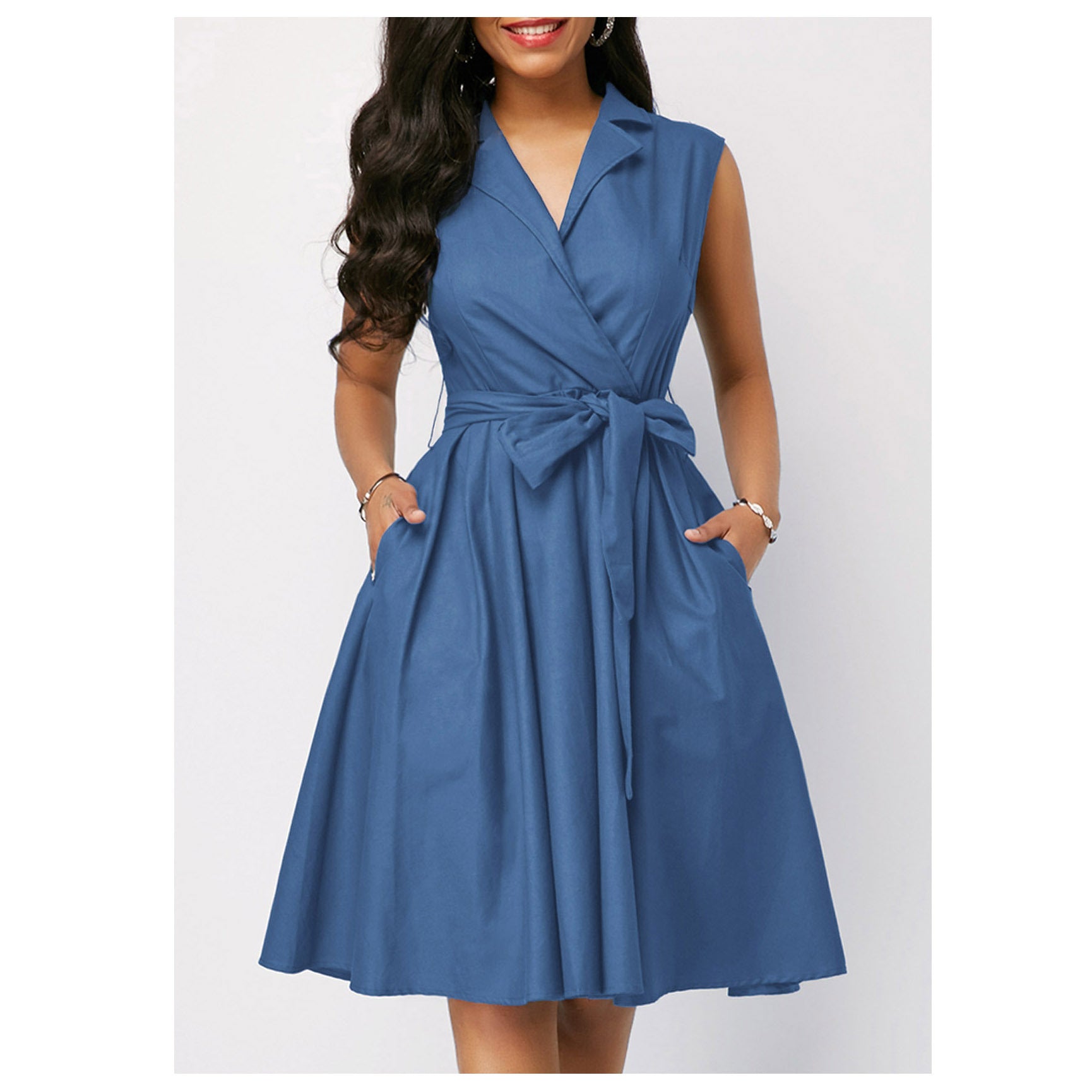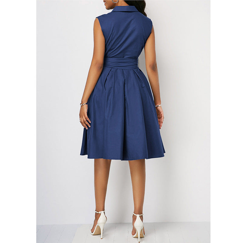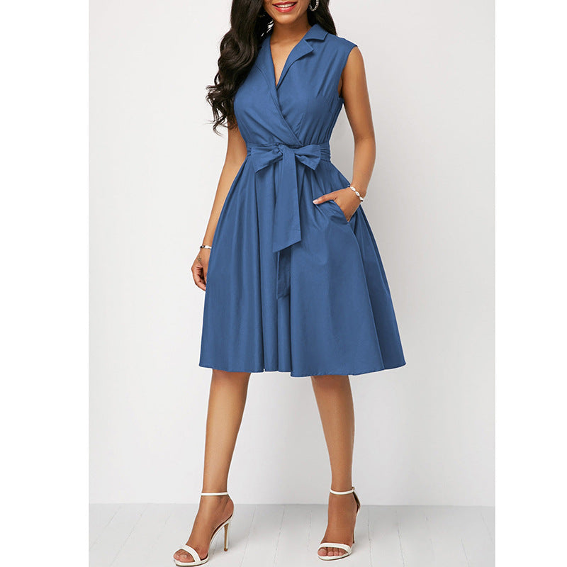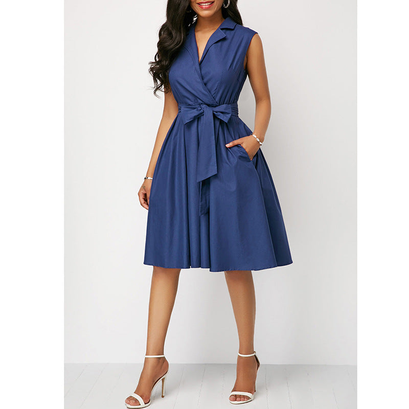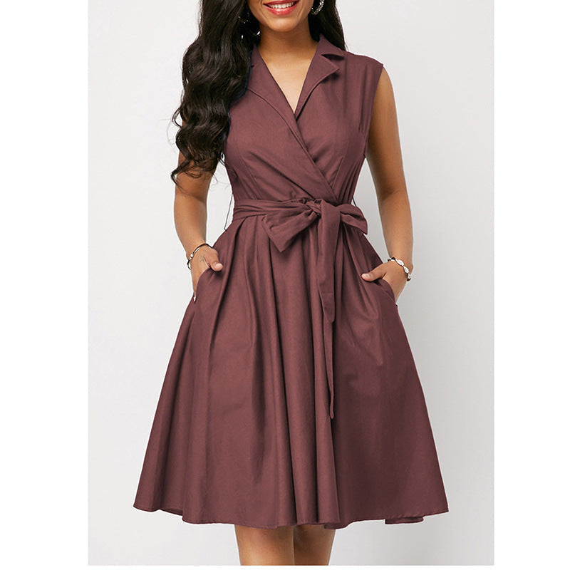 2023 w gorącym stylu jednokolorowa talia bez rękawów, kołnierzyk POLO z klapami i wiązaniem średniej długości sukienka dojeżdżająca do pracy