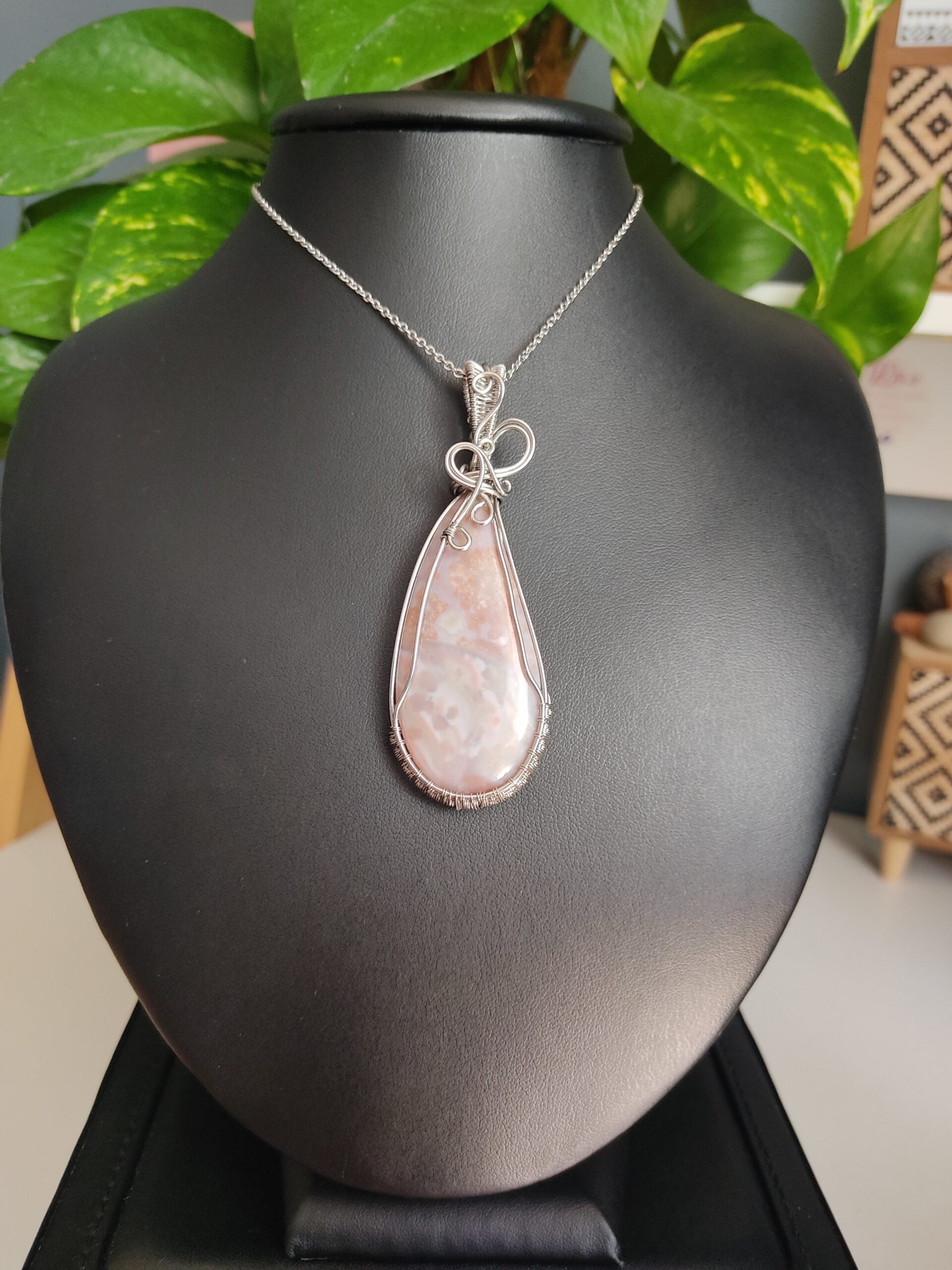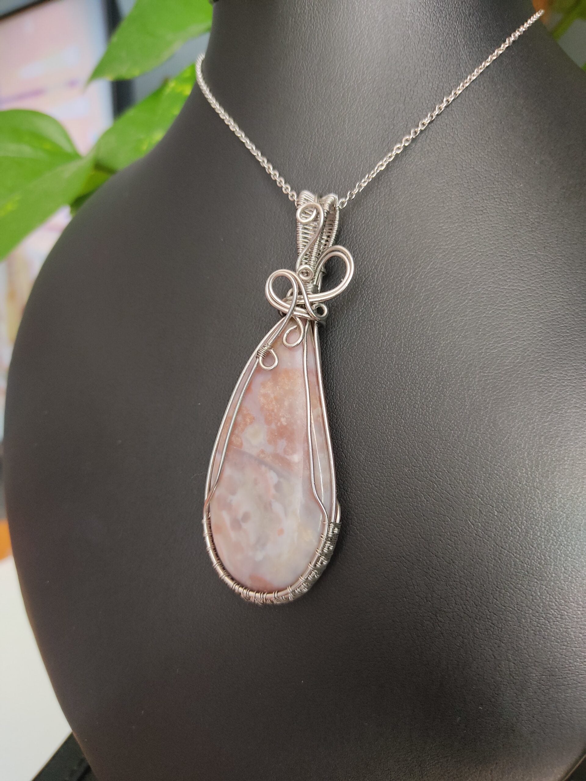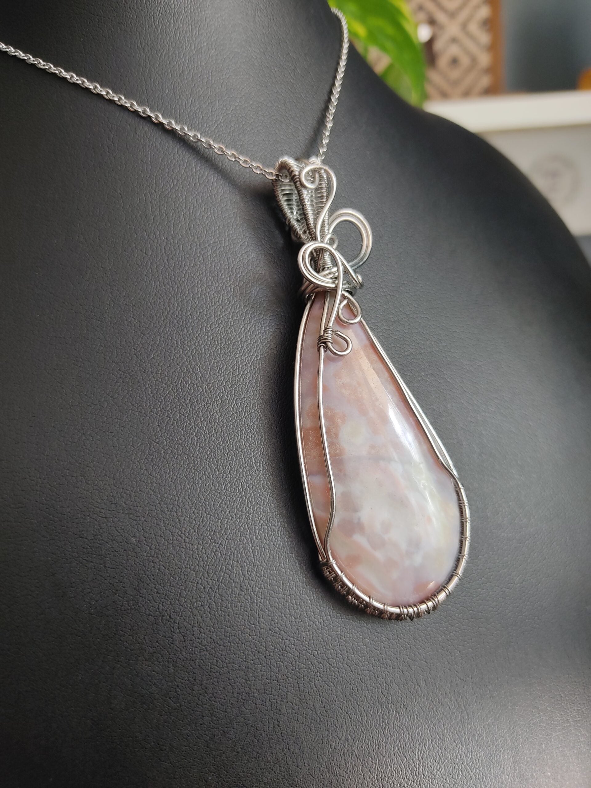 Ręcznie robiony wisiorek z agatem. Wykonany techniką wire wrapping z drutów ze stali chirurgicznej.