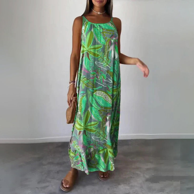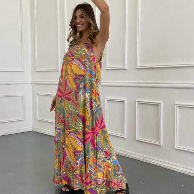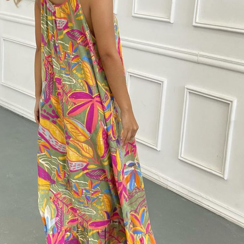 Stylowa i wygodna długa sukienka bez rękawów z nadrukiem. Ta modna sukienka ma oszałamiający nadruk i oferuje idealne połączenie elegancji i swobody na każdą okazję.