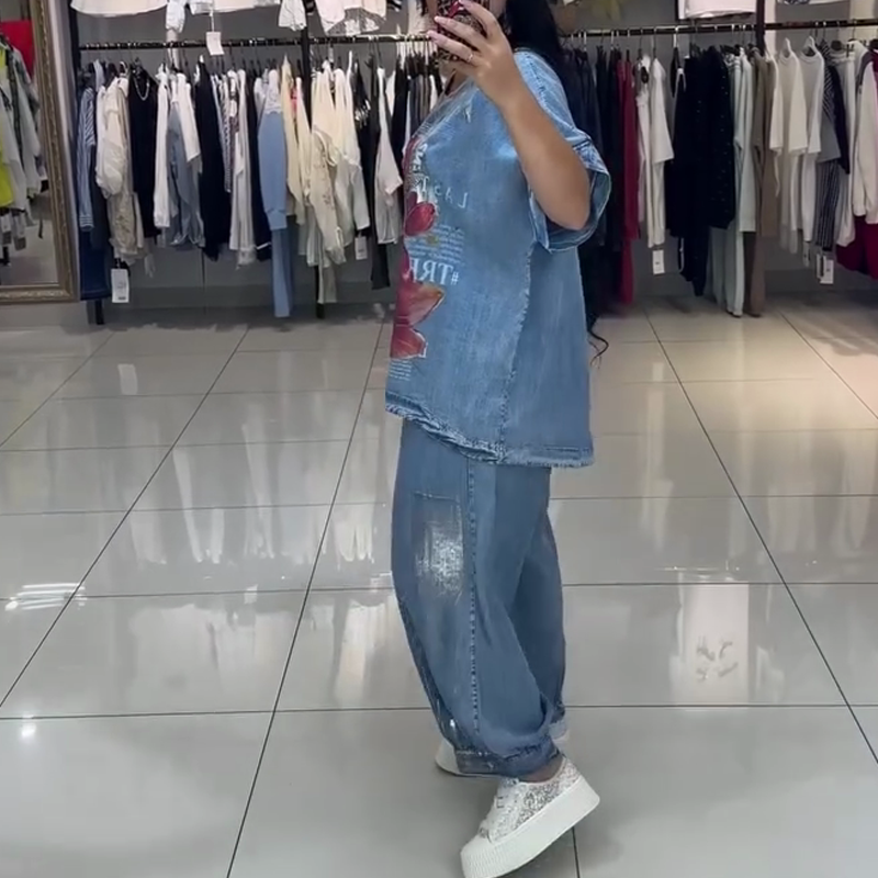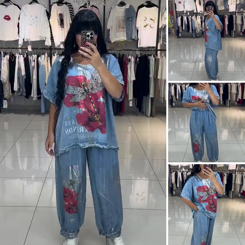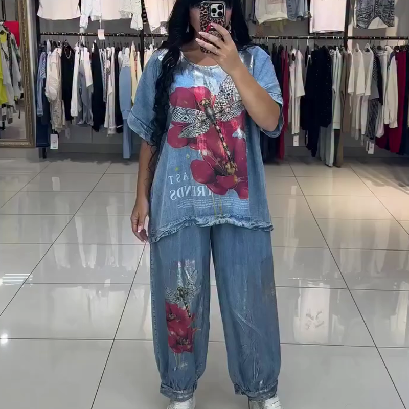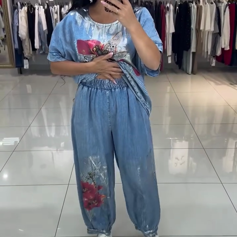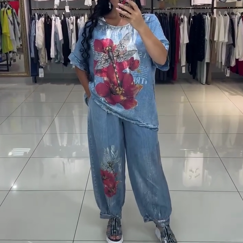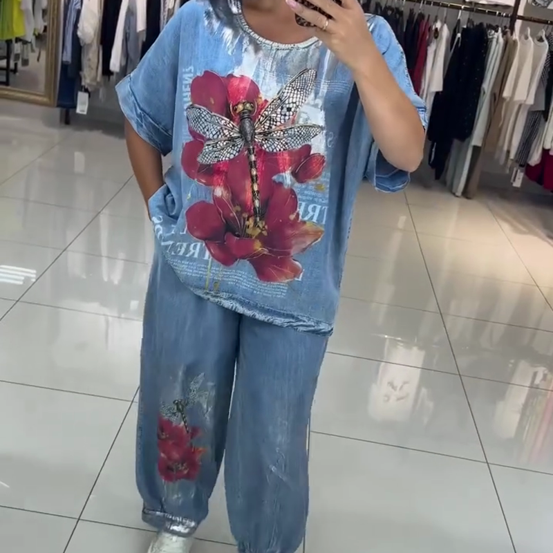 JASNY WZÓR Z NADRUKIEM – Zestaw wyróżnia się przyciągającymi wzrok nadrukami czerwonych kwiatów i ważek. Te jaskrawe wzory na niebieskim topie z krótkim rękawem i pasujących do niego luźnych jeansach tworzą radosny i stylowy look, dodając Twojej stylizacji wyjątkowego charakteru.