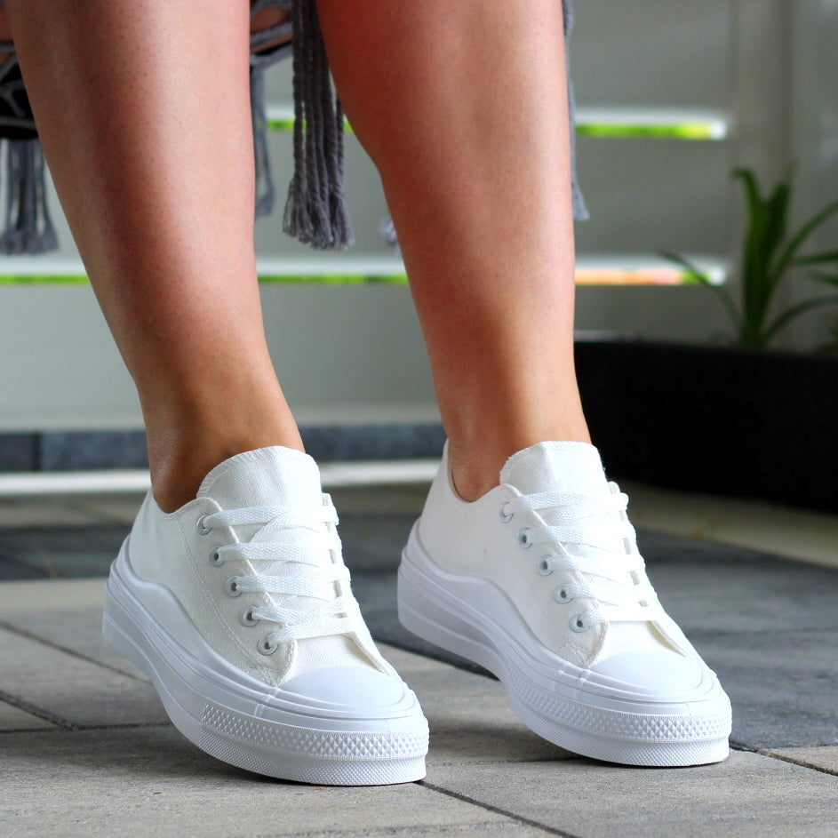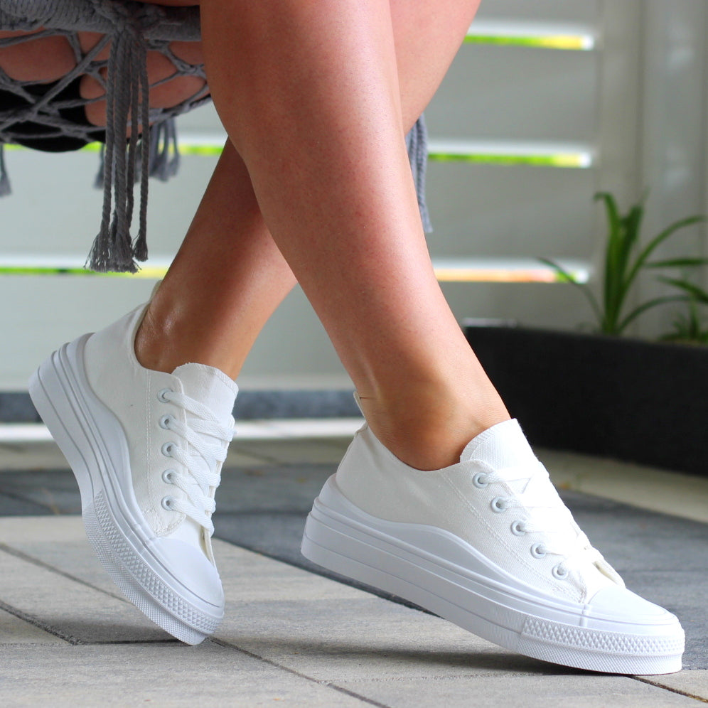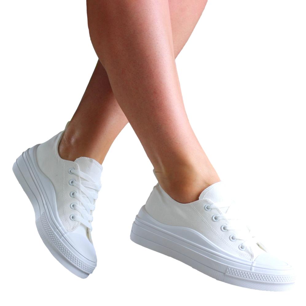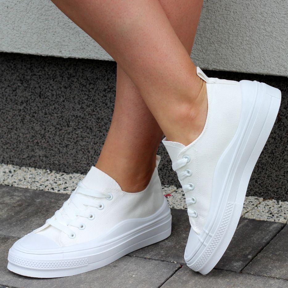 BIAŁE MATERIAŁOWE TRAMPKI DAMSKIE NA GRUBEJ PODESZWIE
