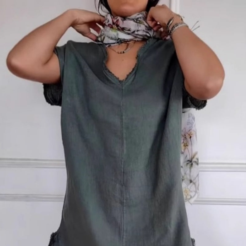 Pakiet zawiera: Skład: 1*Sukienka z lnianej bawełny z dekoltem w serek i rozcięciem na frędzle