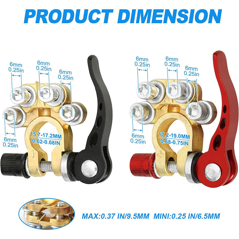 [OZNACZENIE DODATNIE I UJEMNE] Biegun dodatni i ujemny są wyraźnie oznaczone na złączach zacisków akumulatora, co ułatwia ich rozpoznanie. Przeznaczony do przewodów o średnicy 5,2–7,4 mm (AWG 1–4) lub przekroju 16–35 mm. Minimalny rozmiar przewodu: 16 mm (5/8 cala). Maksymalny zacisk przewodu: 9,5 mm/0,37 cala, Mini zacisk przewodu: 6 mm/0,25 cala.