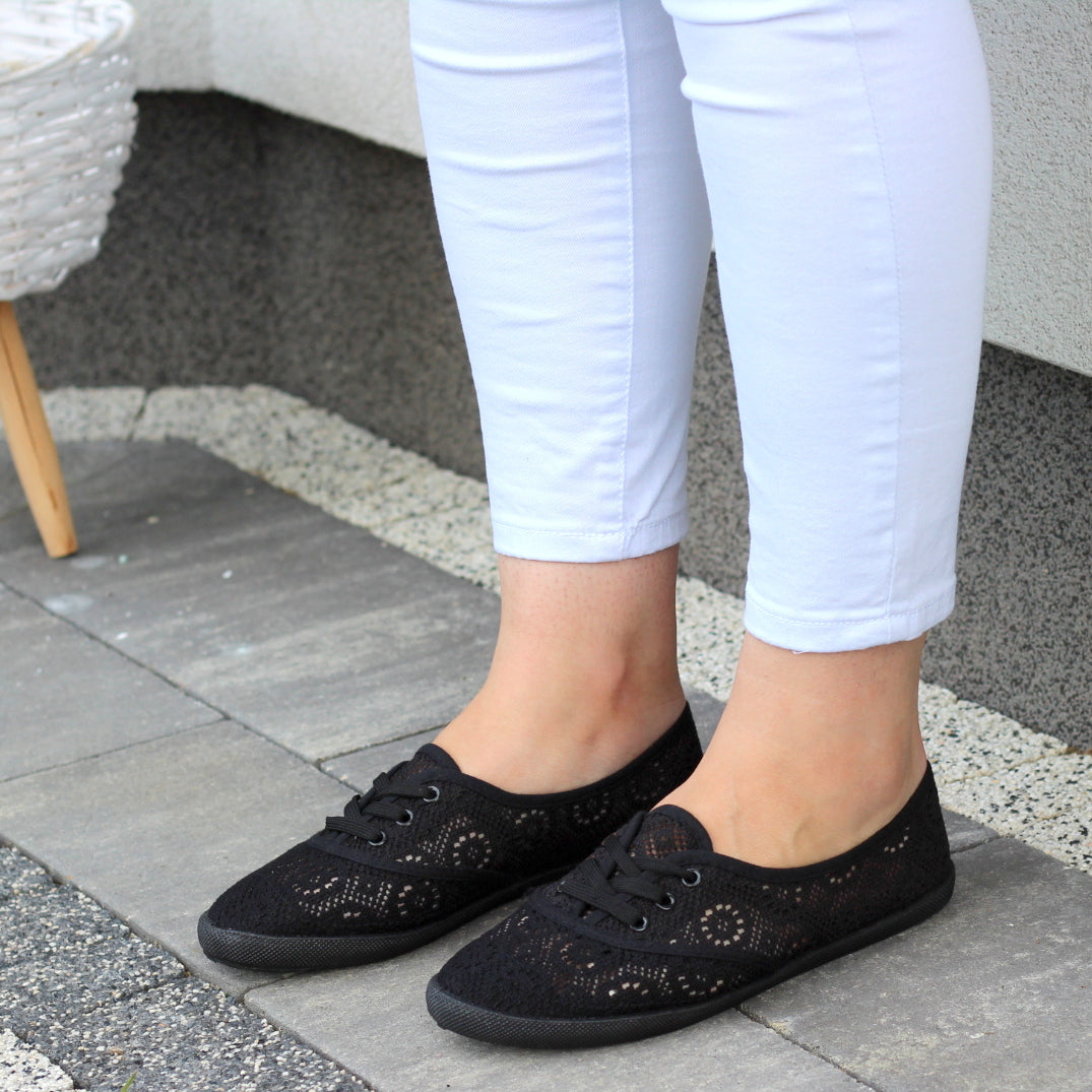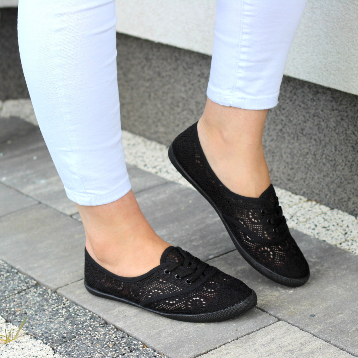 Czarne mięciutkie tenisówki damskie wykonane z przewiewnej koronki