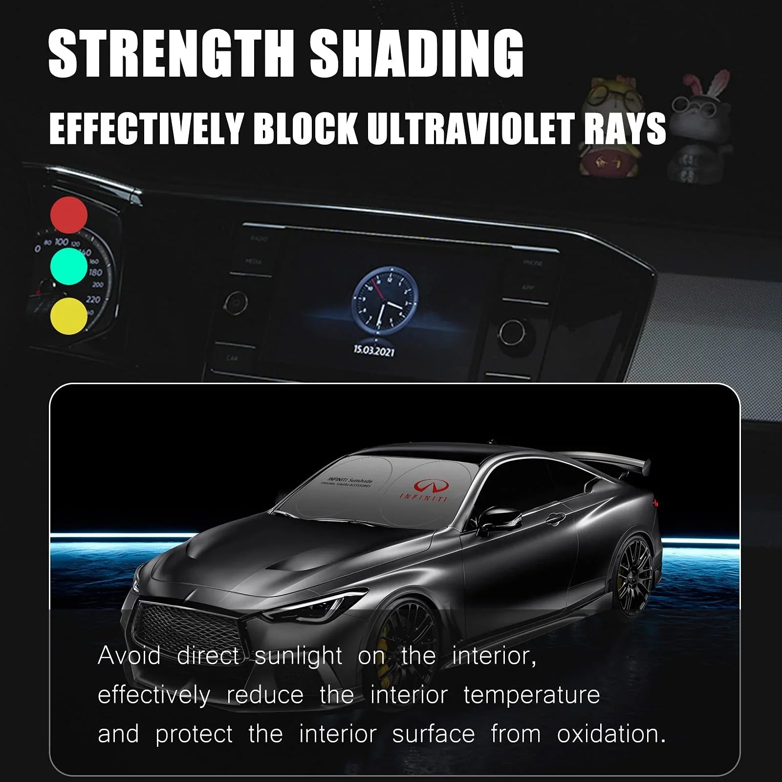 - ☂Skuteczna ochrona przed palącym słońcem i upałem: Promienie UV mogą z czasem uszkodzić elektronikę, deskę rozdzielczą, skórę i siedzenia w samochodzie. Osłony przeciwsłoneczne zostały zaprojektowane tak, aby zapewnić chłód i komfort w środku pojazdu. Zapobiegają również blaknięciu i pękaniu deski rozdzielczej. Dwuwarstwowe pogrubienie, solidna osłona przeciwsłoneczna.