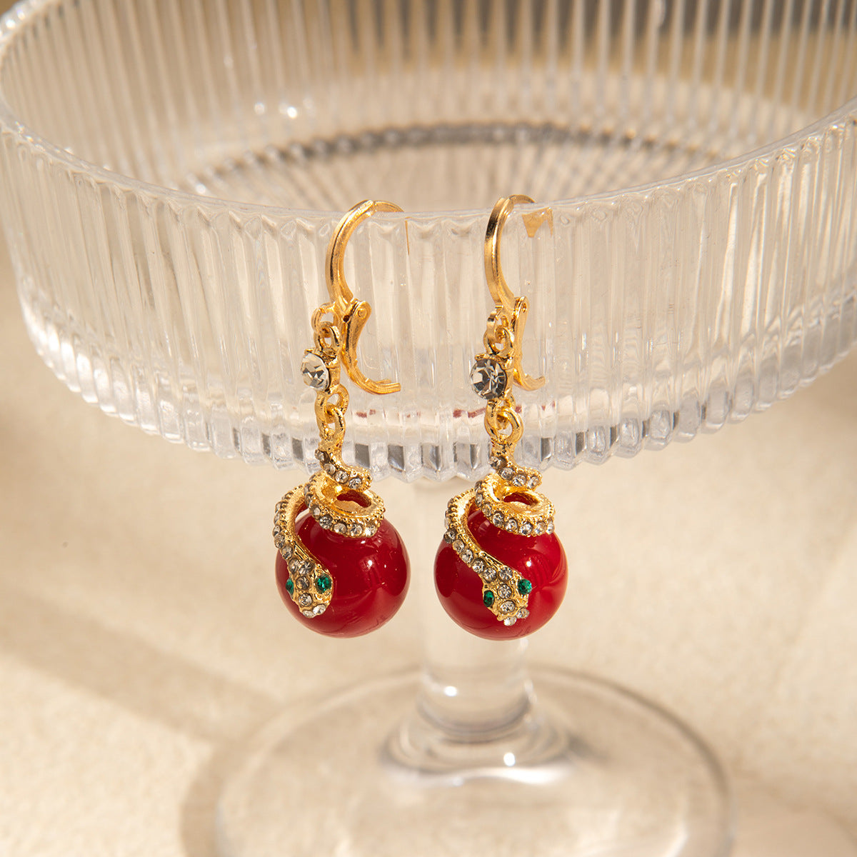 W skład zestawu wchodzą: miedź, czerwień, 1 para * pozłacanych kolczyków z pereł wężowych