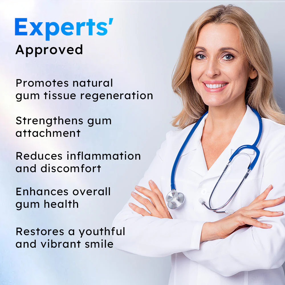 Koenzym Q10  : Znany ze swoich właściwości przeciwutleniających, Koenzym Q10 pomaga zmniejszyć stan zapalny i wspomaga gojenie dziąseł. Wspomaga naturalne mechanizmy naprawcze organizmu, przyczyniając się w ten sposób do odmłodzenia dziąseł.