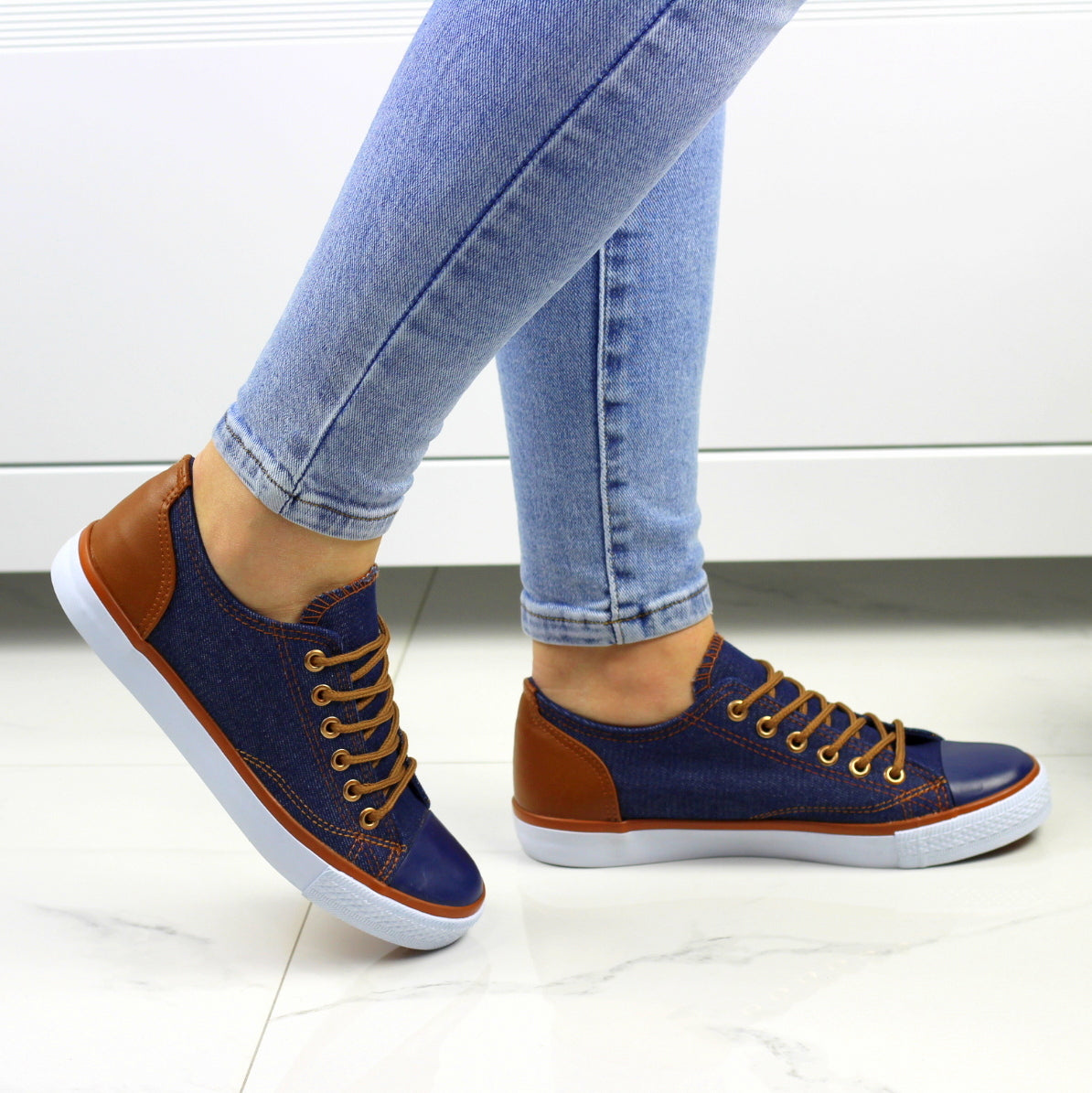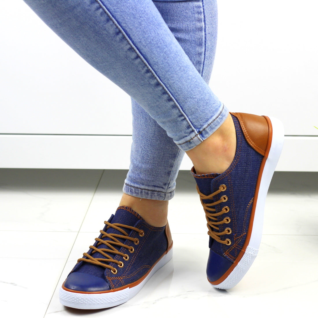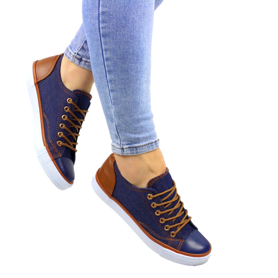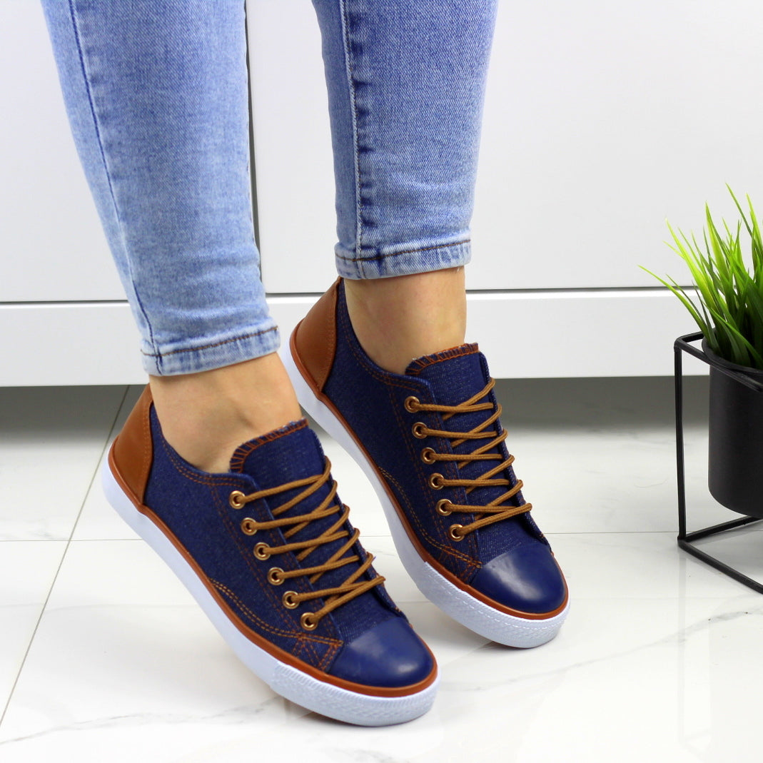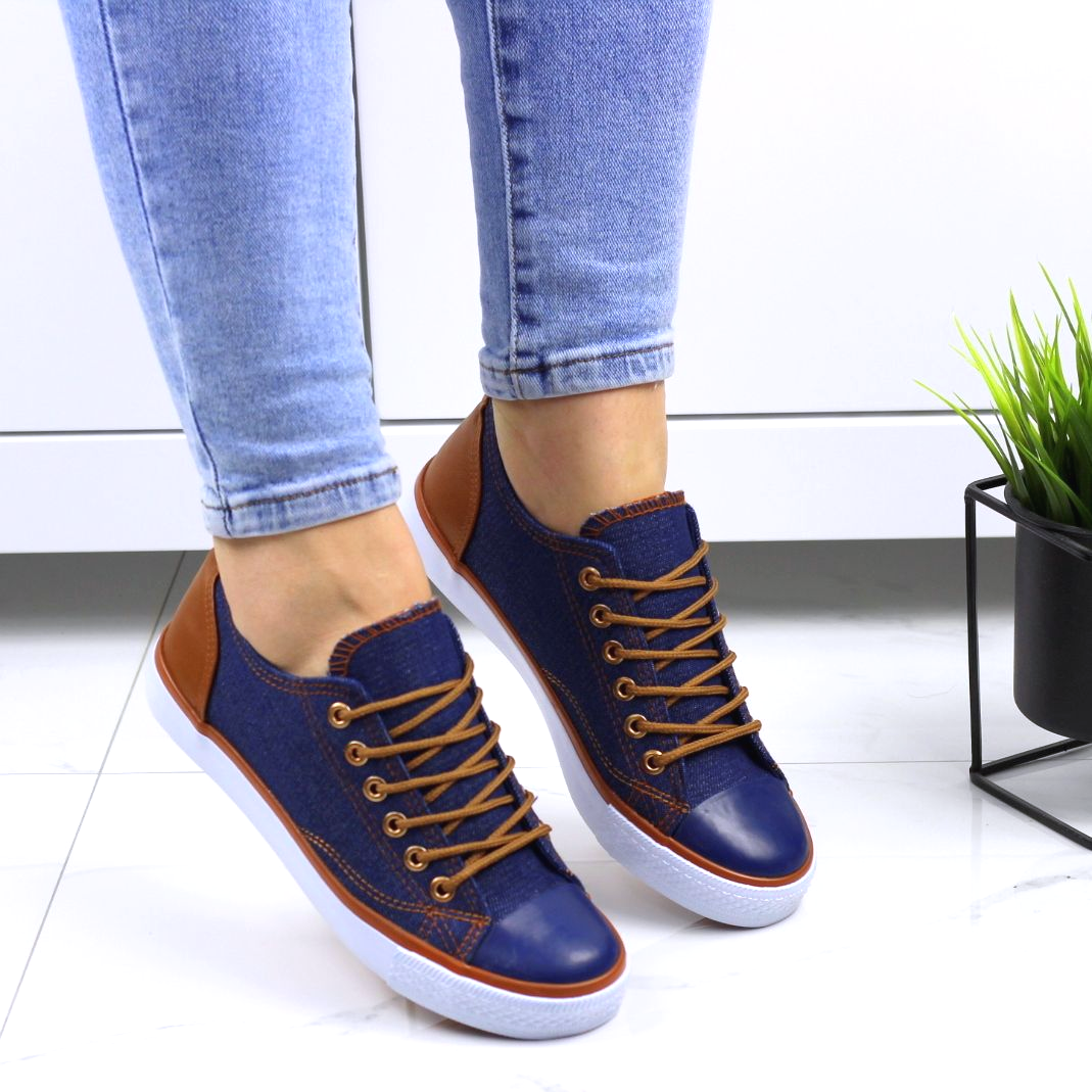 Blue sznurowane gładkie trampki damskie z brązowymi wstawkami