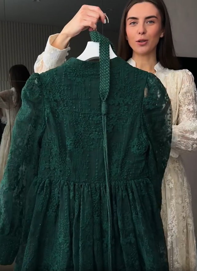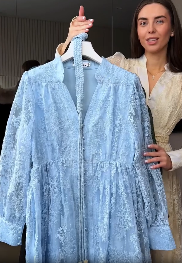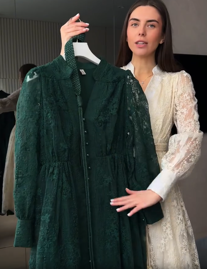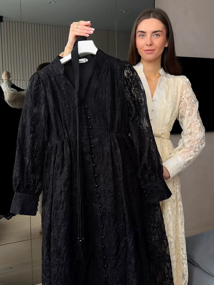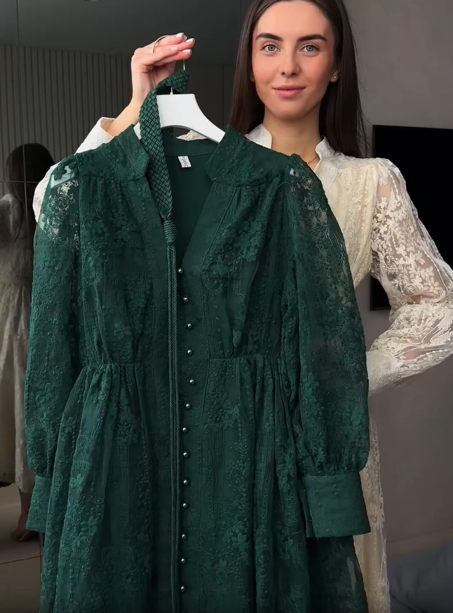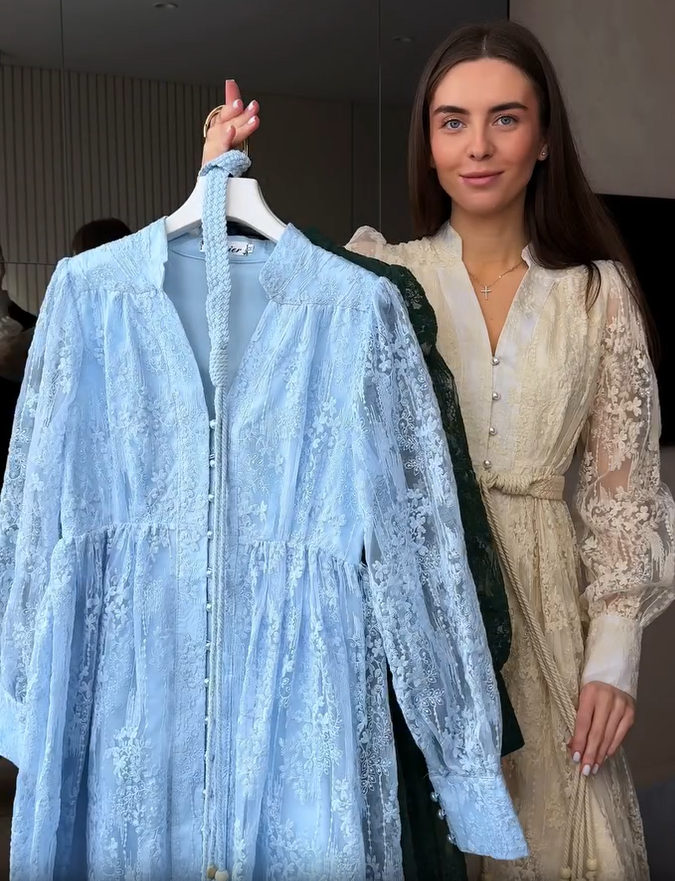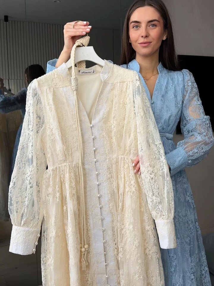 Widoczna jest dbałość o szczegóły: kunszt wykonania koronki, delikatny i wielowarstwowy wzór oraz wyrafinowane wykończenie dekoltu i mankietów dodają sukience odrobiny wyrafinowania.