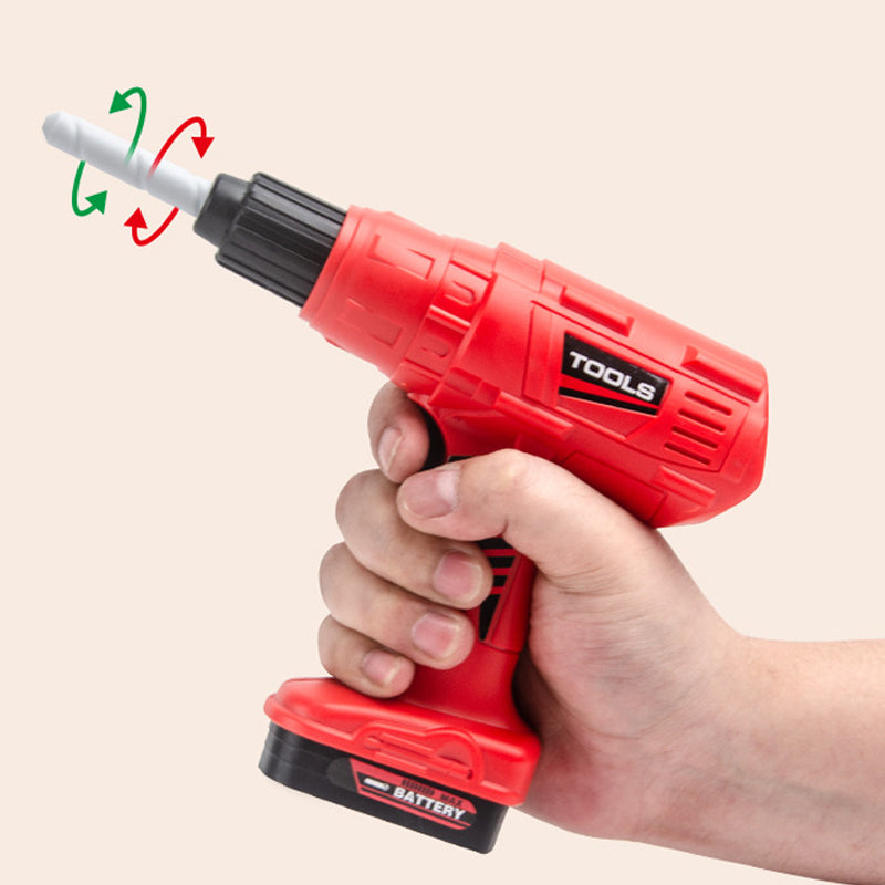 WIERTARKA ELEKTRYCZNA: Wyposażona w zasilaną bateryjnie wiertarkę elektryczną z obrotami do przodu i do tyłu. Bezpieczna dla dzieci, pozwala im doświadczyć rzeczywistych funkcji narzędzi, zapewniając jednocześnie nieszkodliwą zabawę w udawanie.
