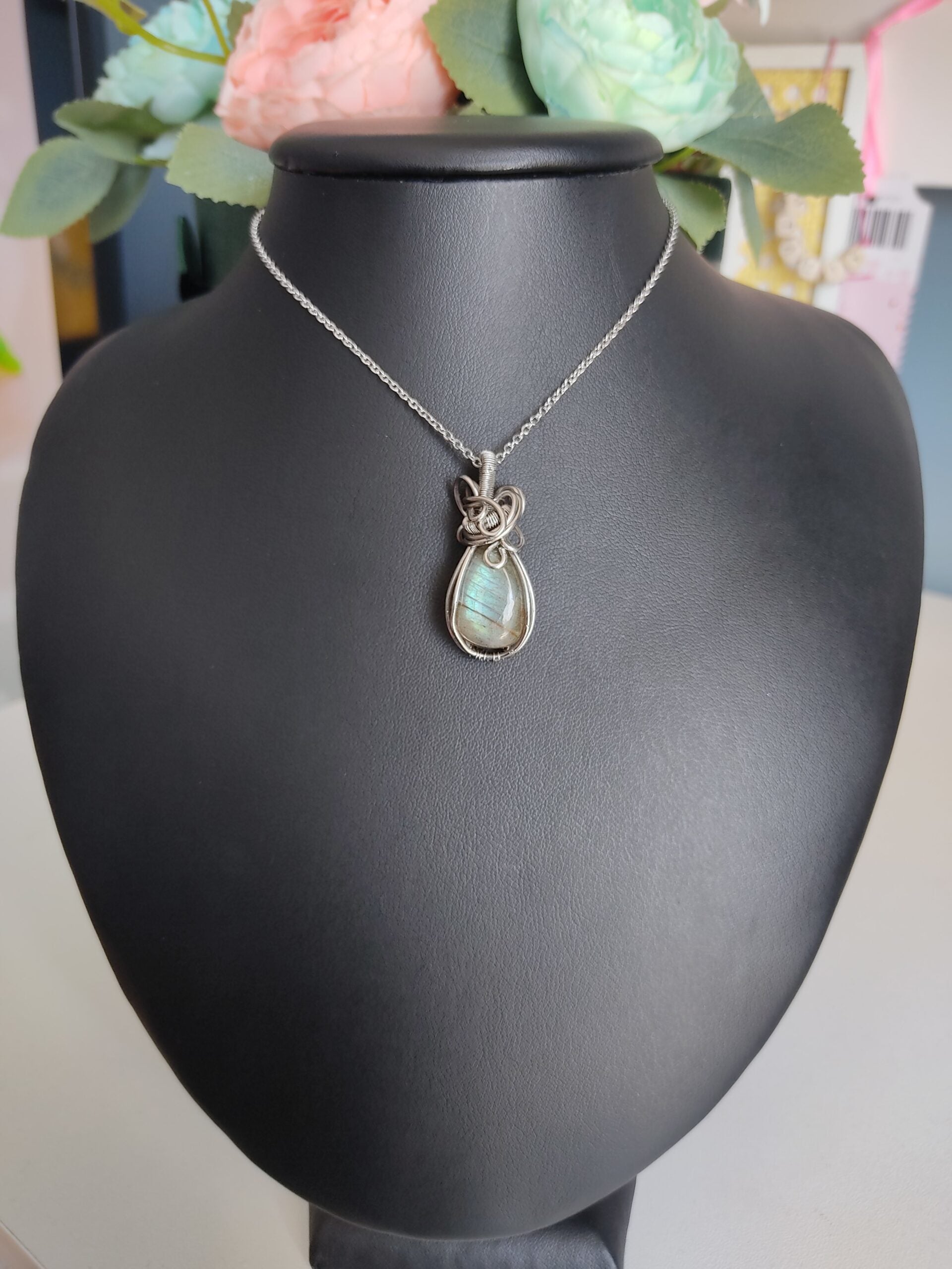 Ręcznie robiony wisiorek z labradorytem. Wykonany techniką wire wrapping z drutów ze stali chirurgicznej.