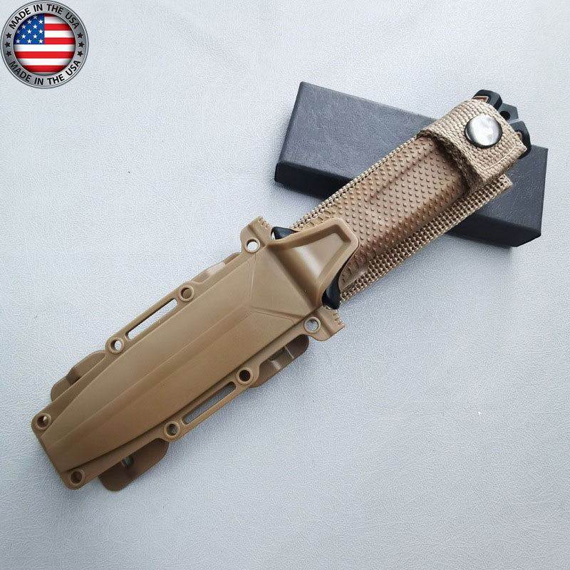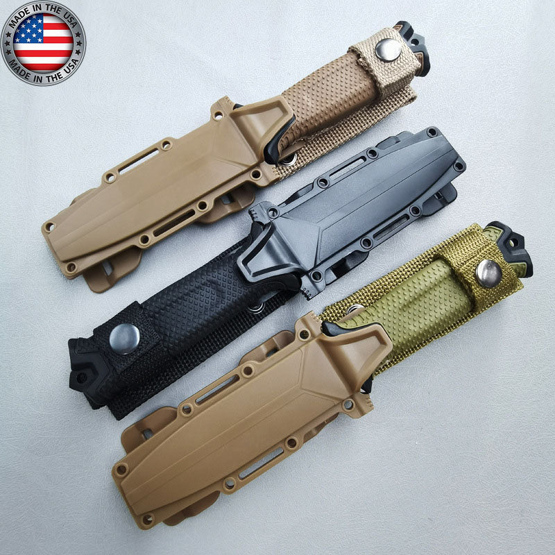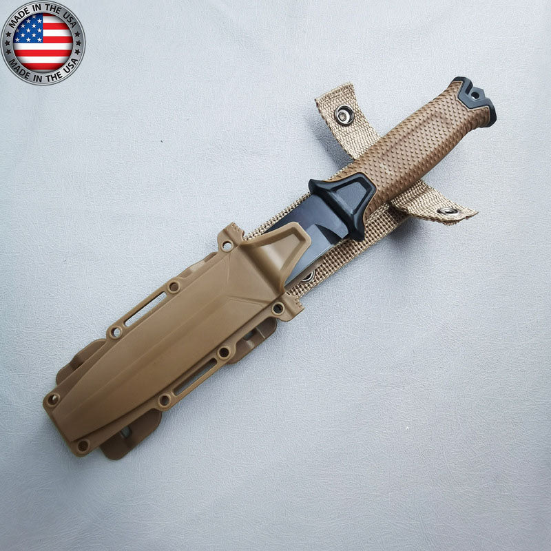 - Modułowy system pochew StrongArm jest równie ważny jak sam nóż. Zatrzaskowe elementy pochewki pozwalają operatorowi przymocować nóż pionowo do MOLLE, poziomo do standardowego pasa taktycznego 1,75" lub do tradycyjnego pasa typu drop-foot. Stałe ostrze StrongArm zostało zaprojektowane i wyprodukowane w Portland w stanie Oregon.