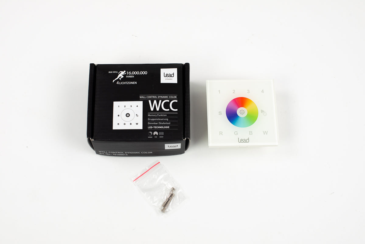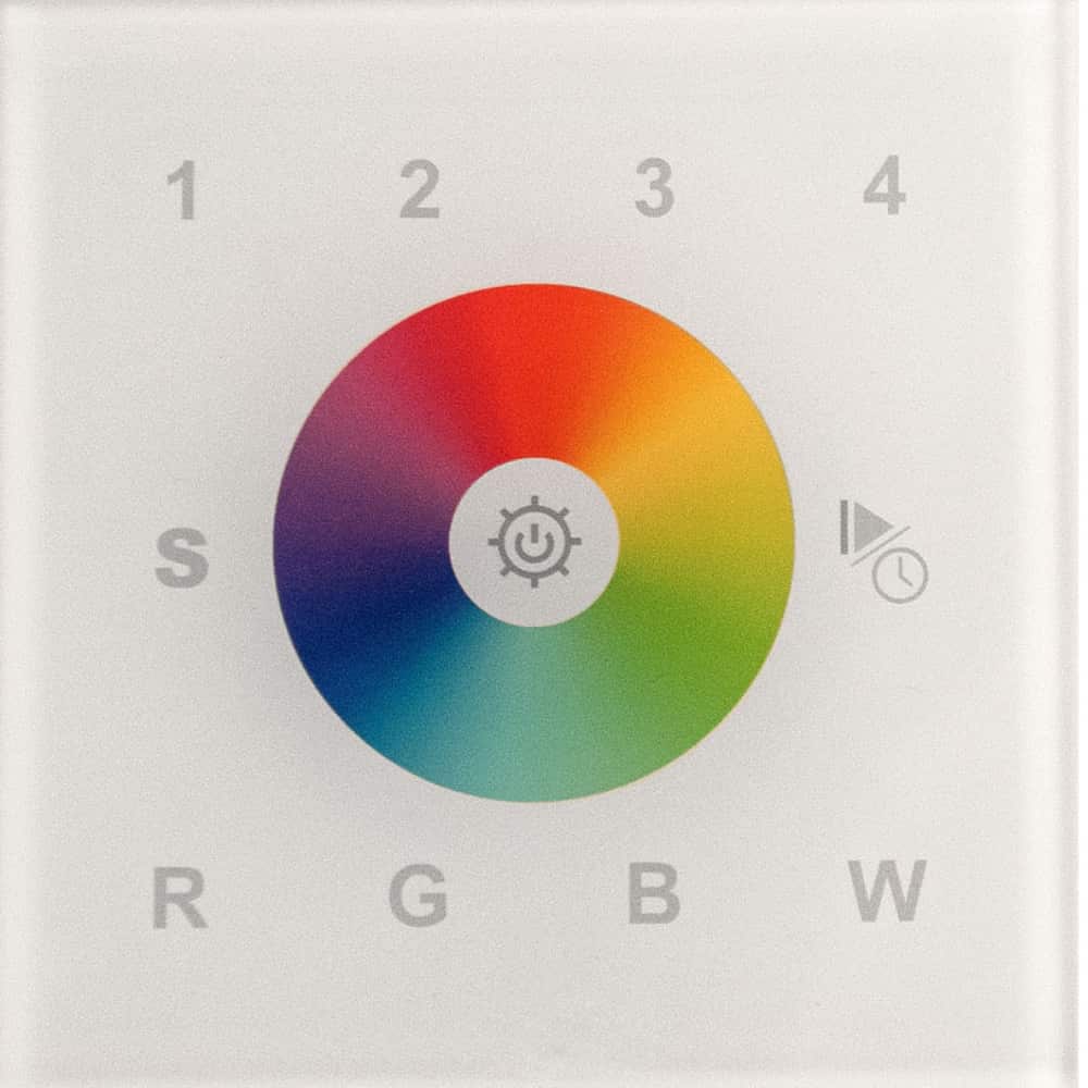Za pomocą tego przełącznika ściennego można również stale ściemniać panel i przełączać między kolorami światła (16 000 000 możliwych kolorów) i dziesięcioma działającymi programami świetlnymi.