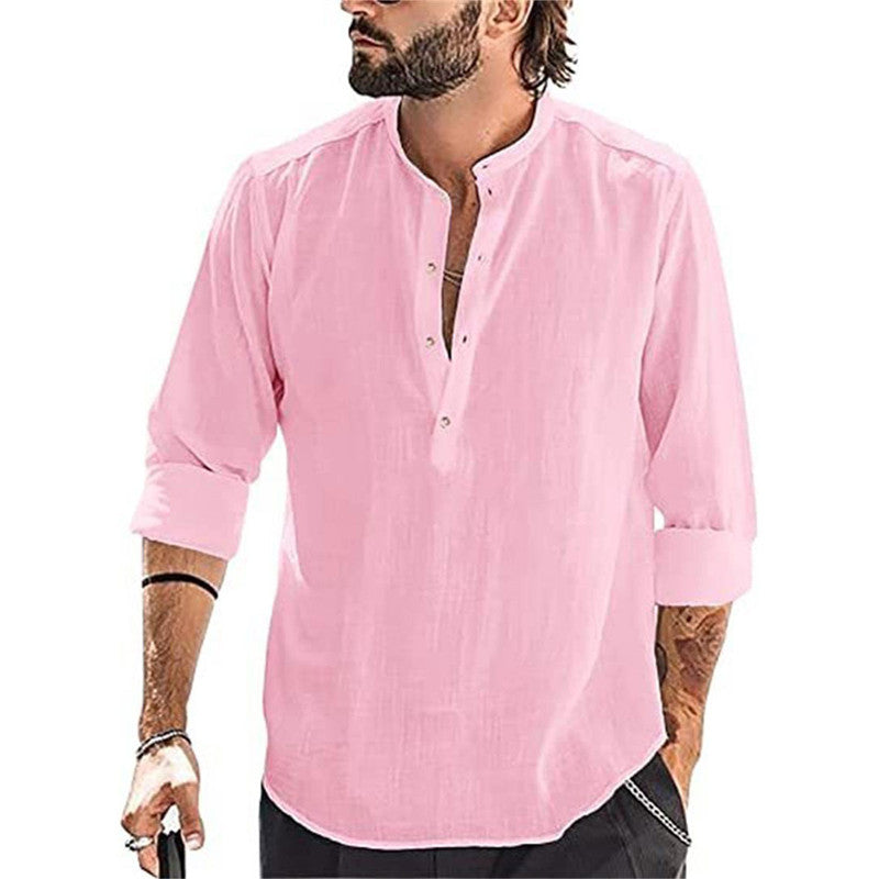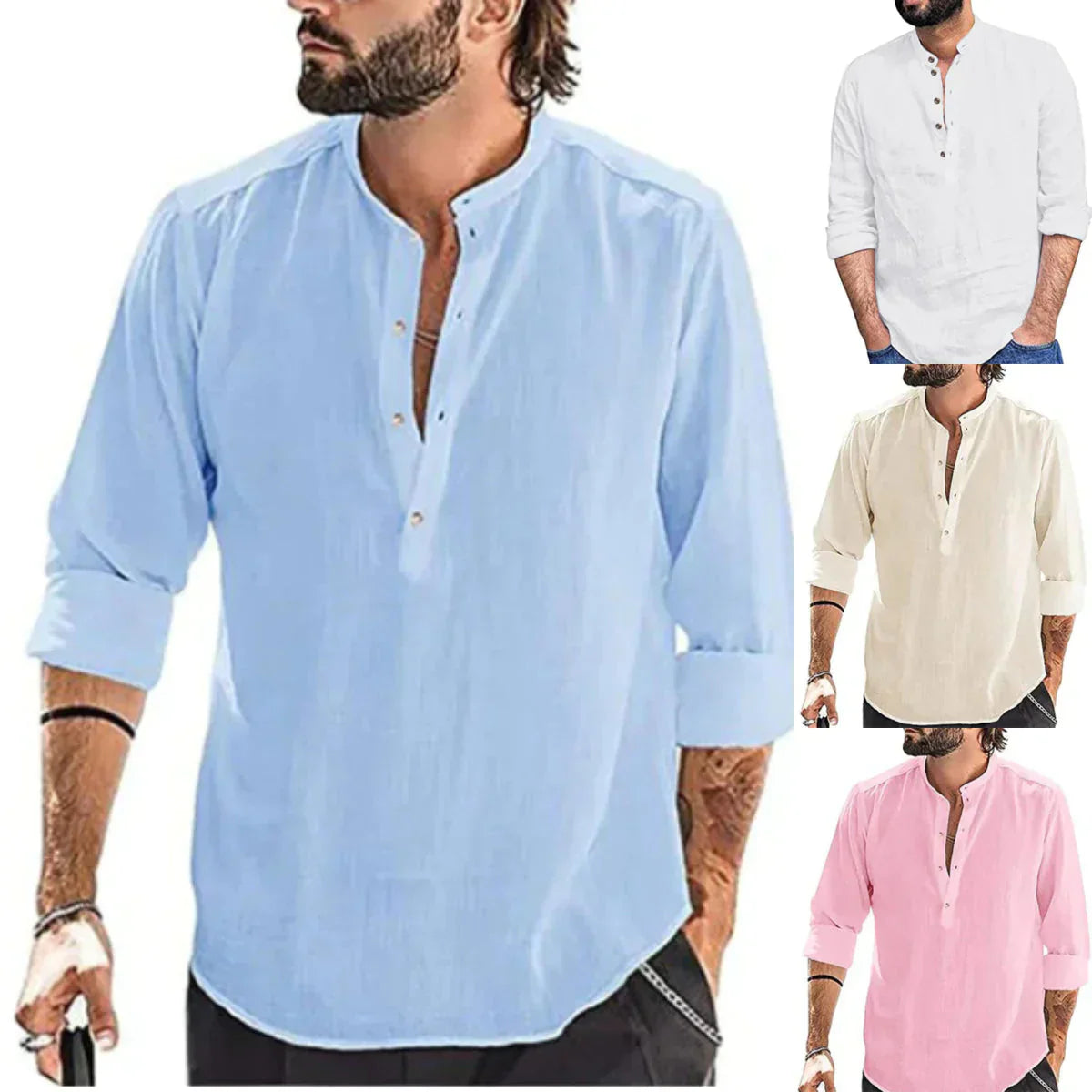 【Charakterystyka】 Casualowa męska koszula lniana ze stójką, jednolity kolor, slim fit, długie rękawy (podwinięte) i zapięcie na guziki..