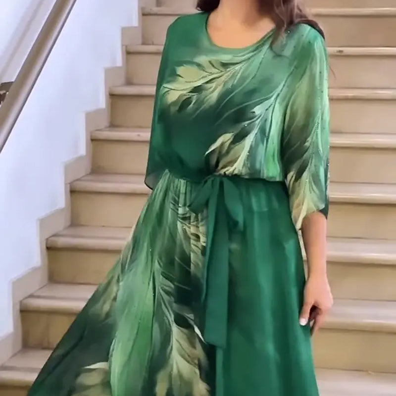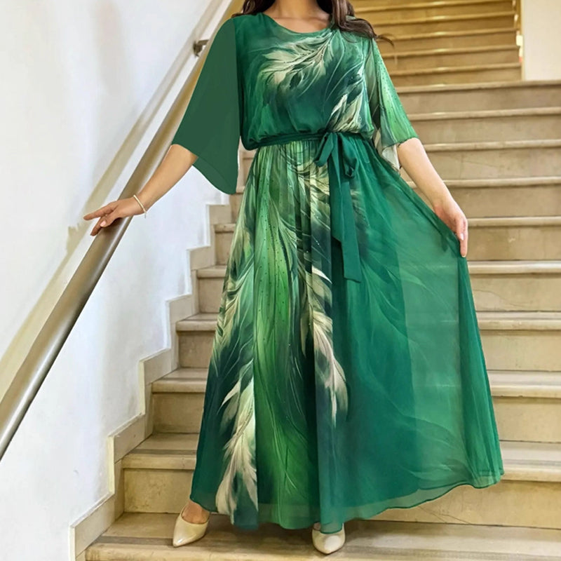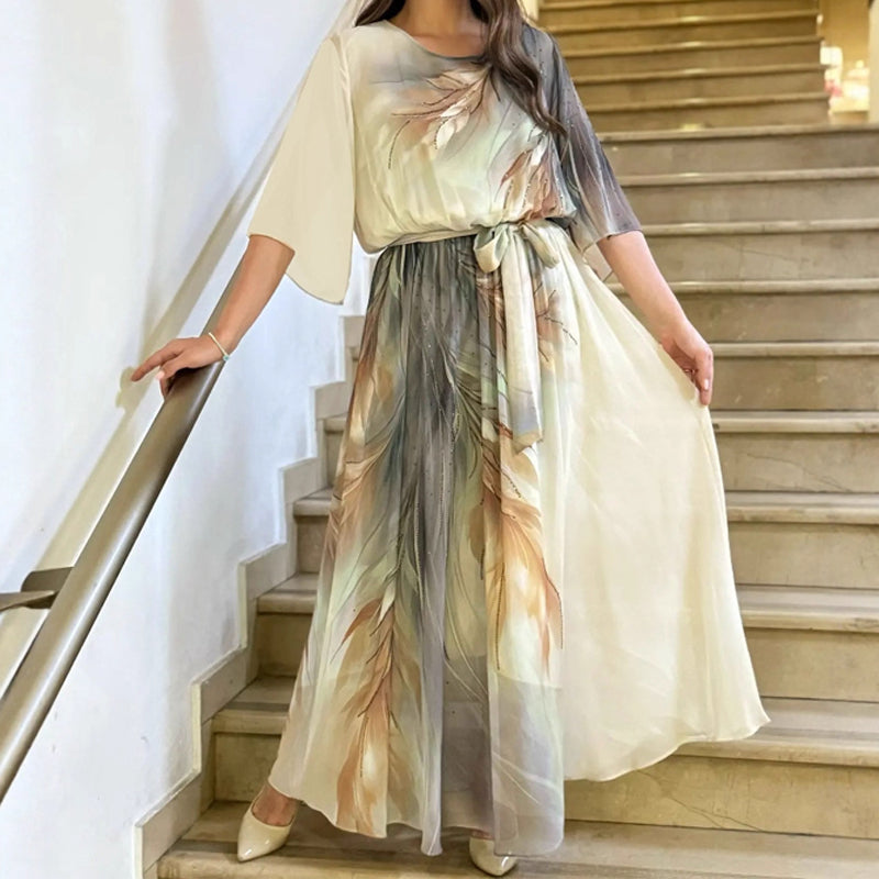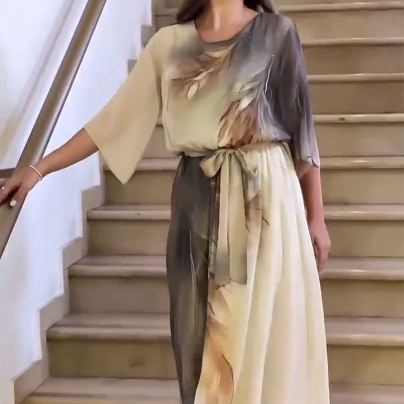 ELEGANCKIE I PŁYNNE WYKOŃCZENIE – Ta sukienka maxi z okrągłym dekoltem charakteryzuje się płynną sylwetką i unikalnym, nieregularnym nadrukiem, zapewniając wyrafinowaną elegancję zarówno na co dzień, jak i na formalne okazje. Lekki materiał gwarantuje komfort i styl przez cały dzień.