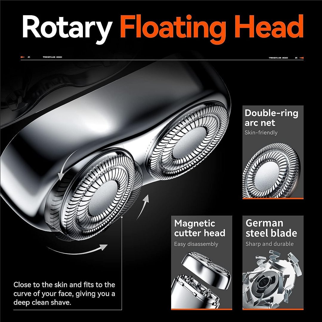Ostre, wirujące ostrze ze stali nierdzewnej, specjalnie zaprojektowane do trudnych zarostów, cienka folia ze stali nierdzewnej o grubości 0,1 mm, podwójna siatka ostrzy 3D, zwiększa objętość golenia, wygładza powierzchnię łuku świetlnego i usuwa włosy ze skóry.