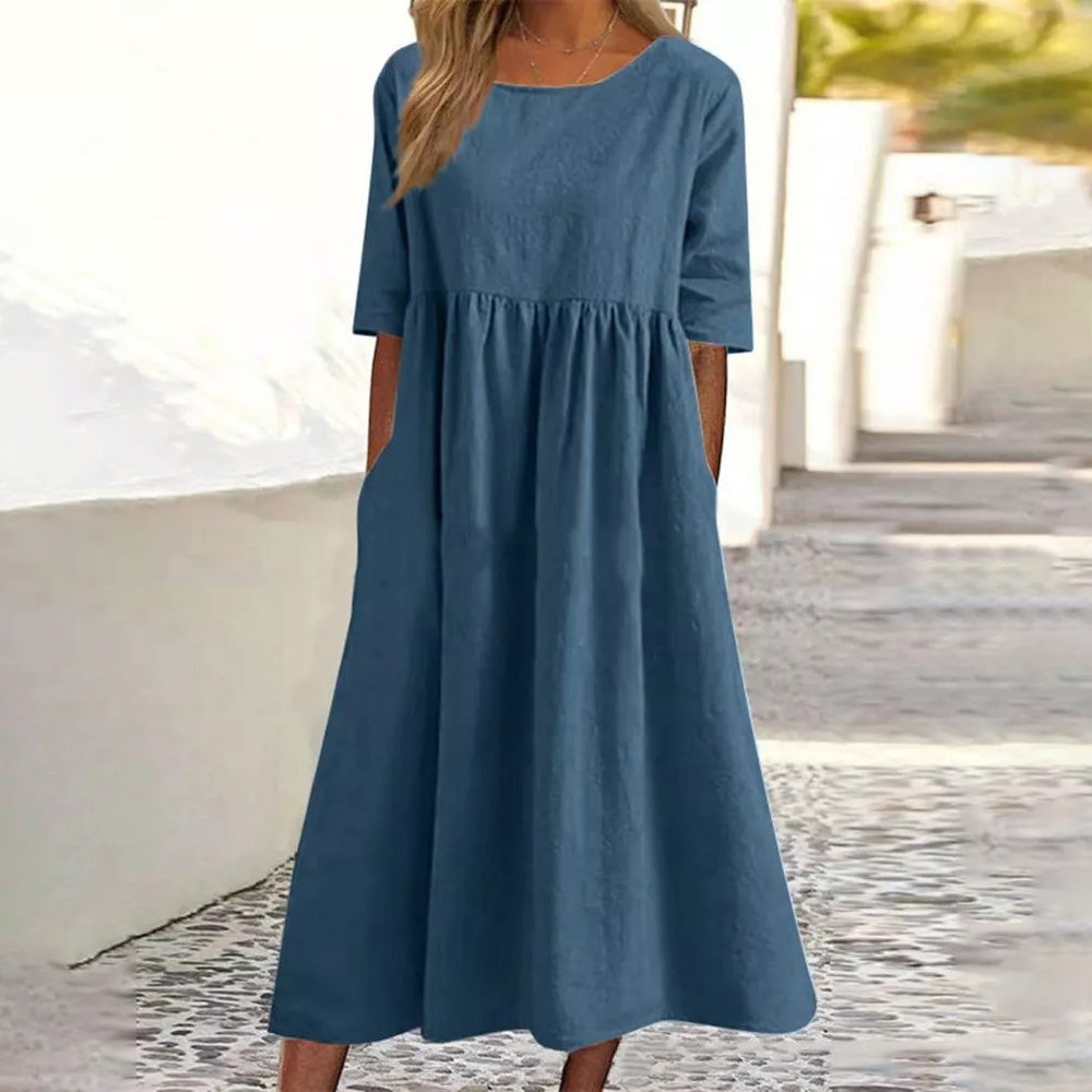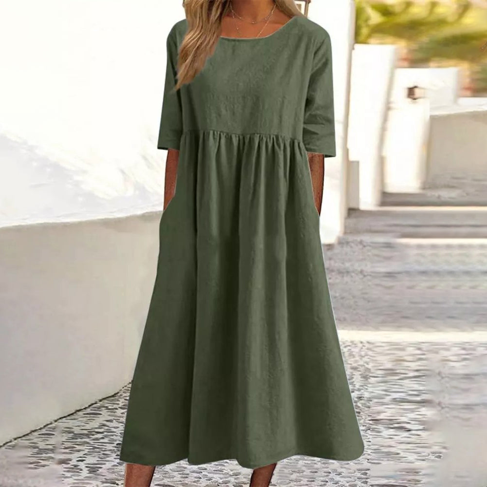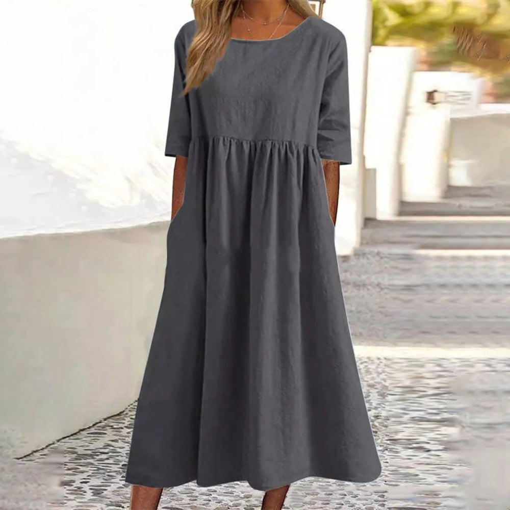 Nowa bawełna len krótki rękaw luźna sukienka