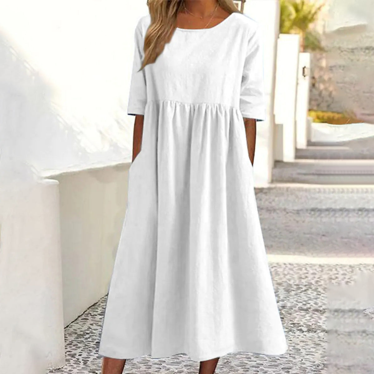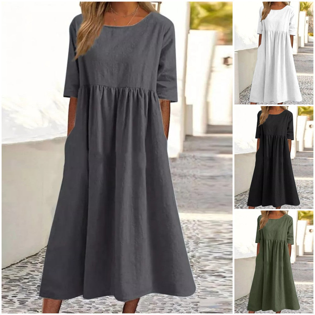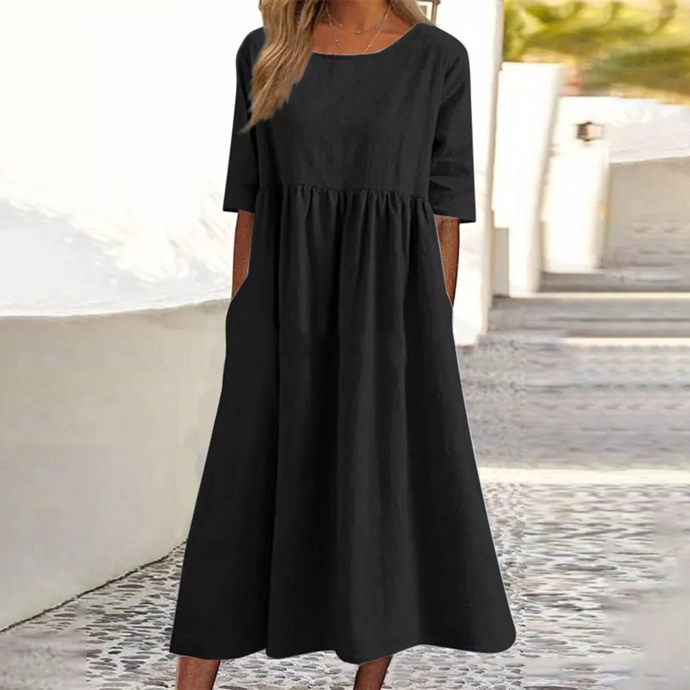 Nowa bawełna len krótki rękaw luźna sukienka