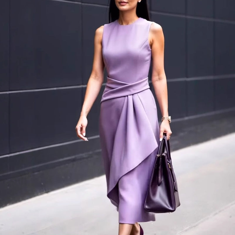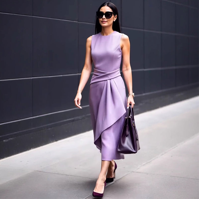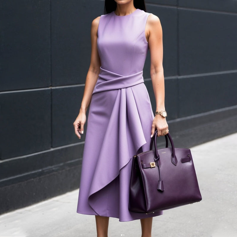 Wykonany z wykorzystaniem strategicznych technik plisowania, ten bezrękawnik naturalnie przylega do ciała, zachowując elegancką sylwetkę. Asymetryczne plisowanie optycznie wydłuża sylwetkę, subtelnie podkreślając talię i krągłości bioder, tworząc wyrzeźbioną sylwetkę, idealną zarówno na co dzień, jak i na wieczorne spotkania.