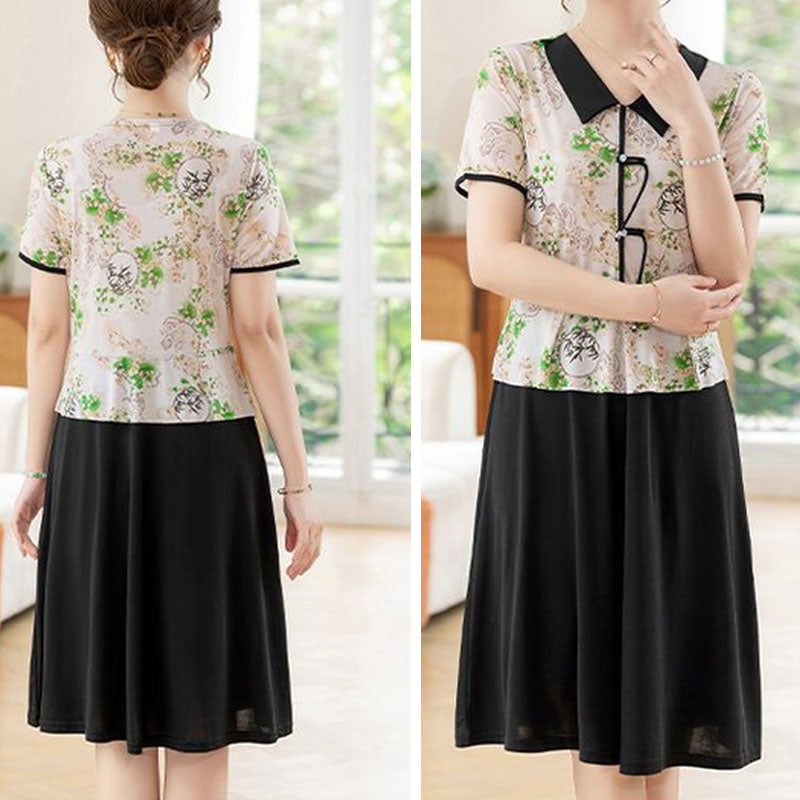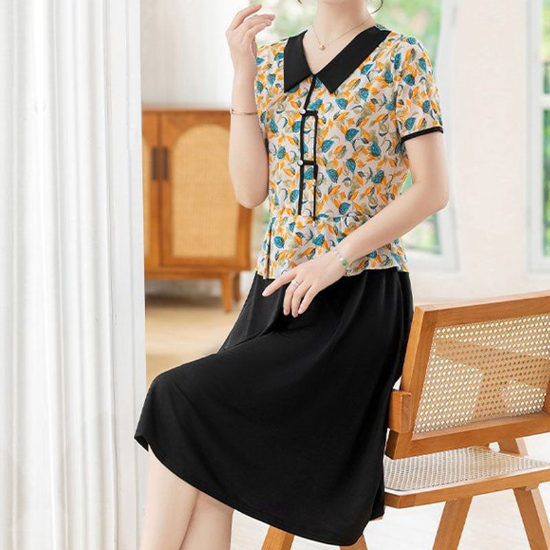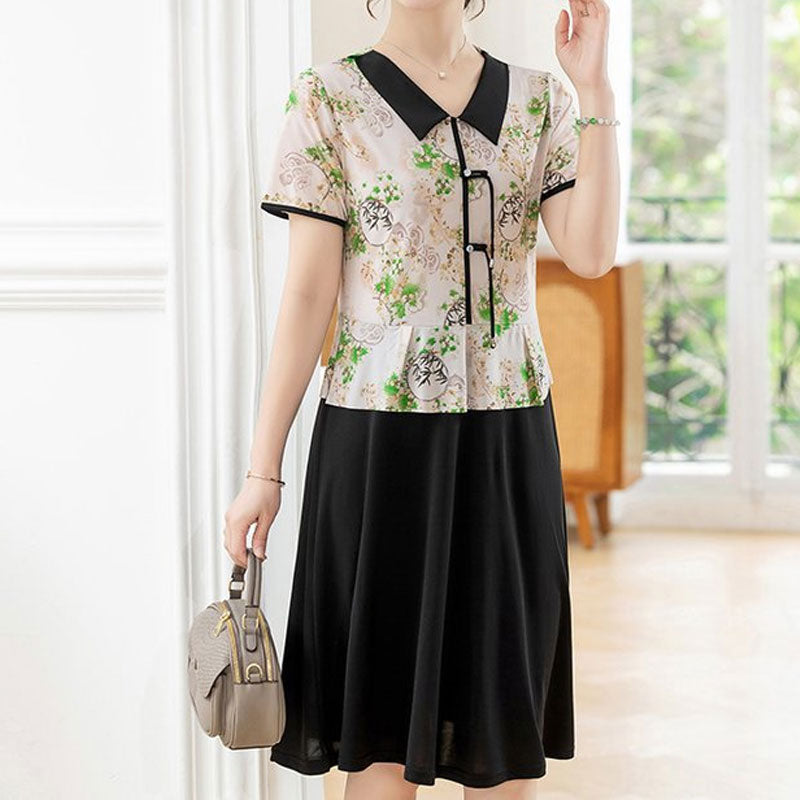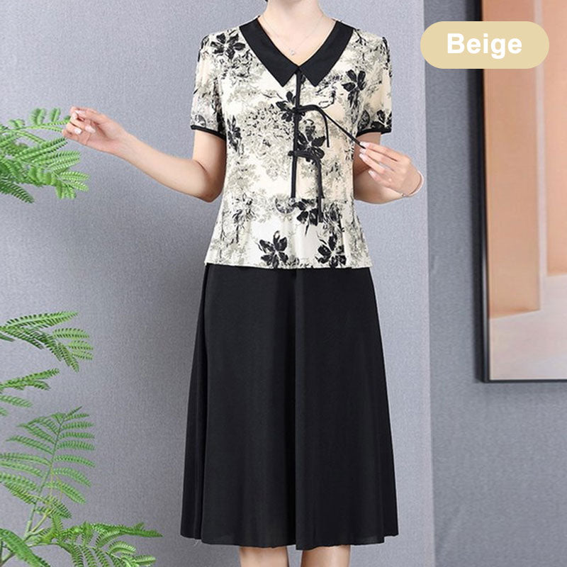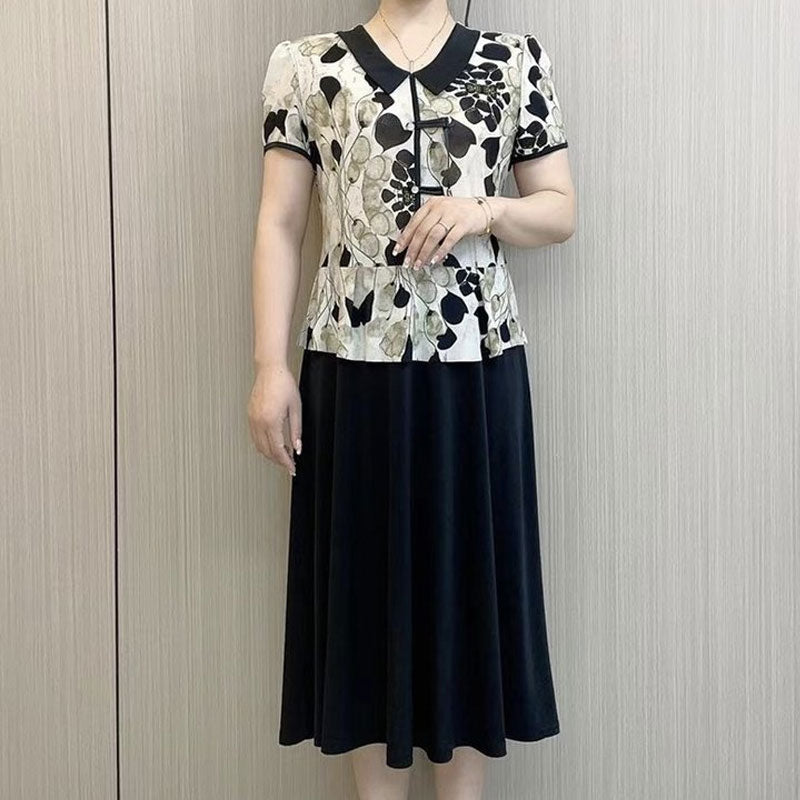 Stylowy, dwuczęściowy wygląd: Panele z kwiatowym nadrukiem tej sukienki płynnie łączą się z solidną czarną podstawą, dając złudzenie szykownego dwuczęściowego wyglądu.