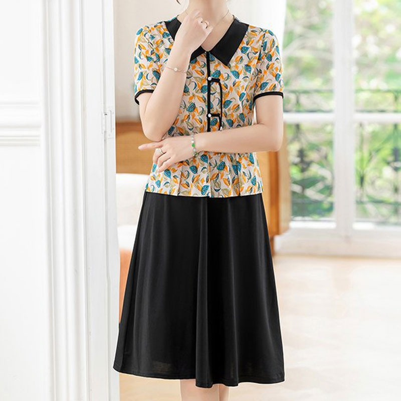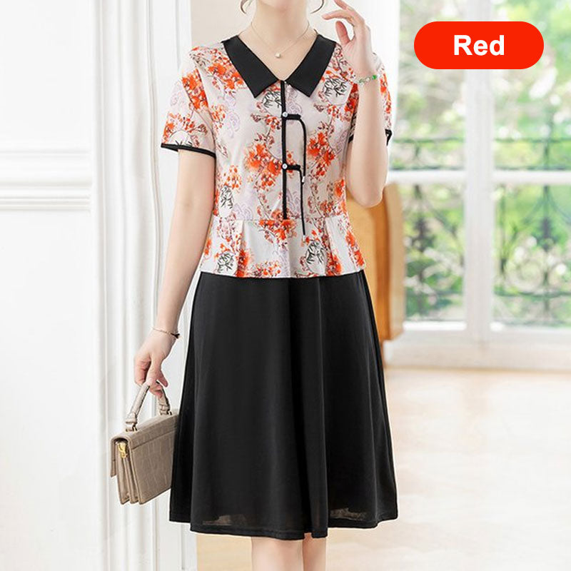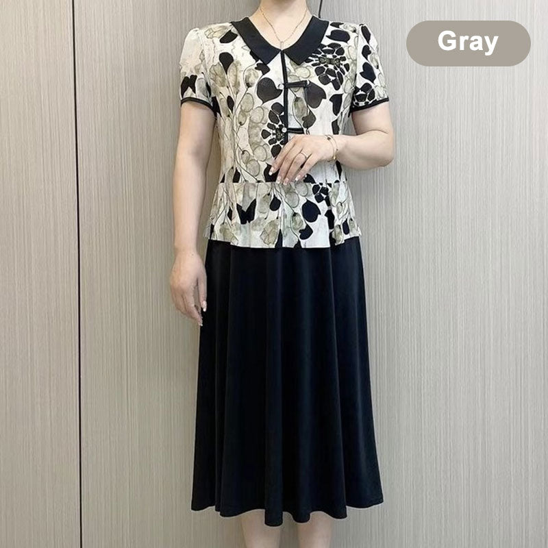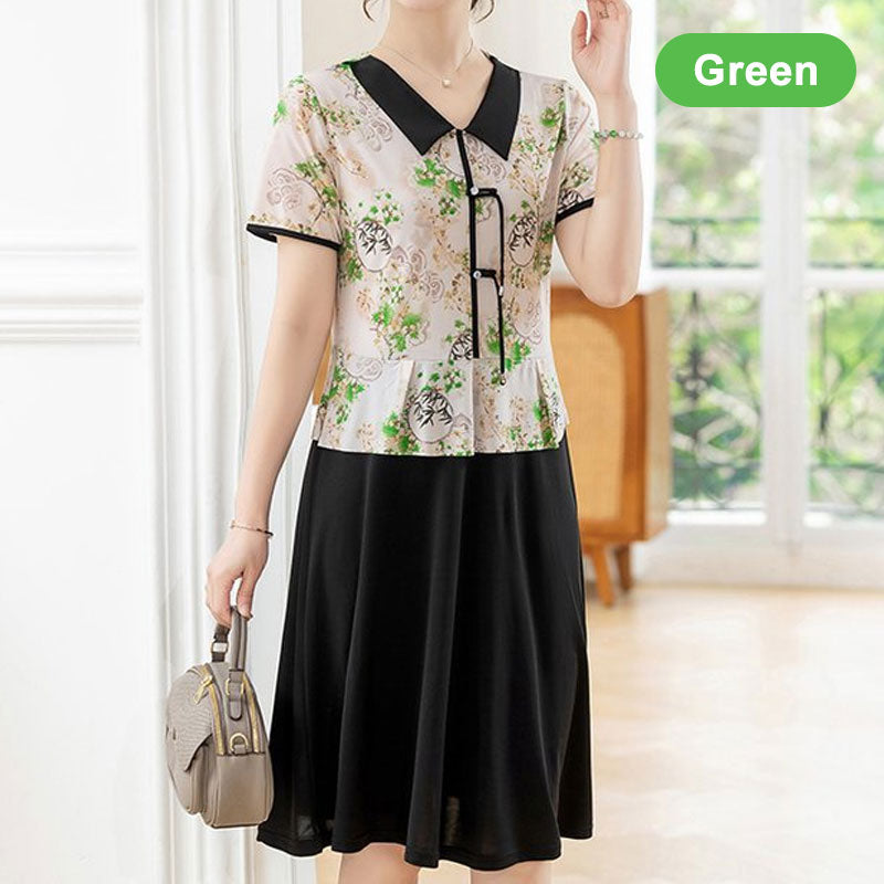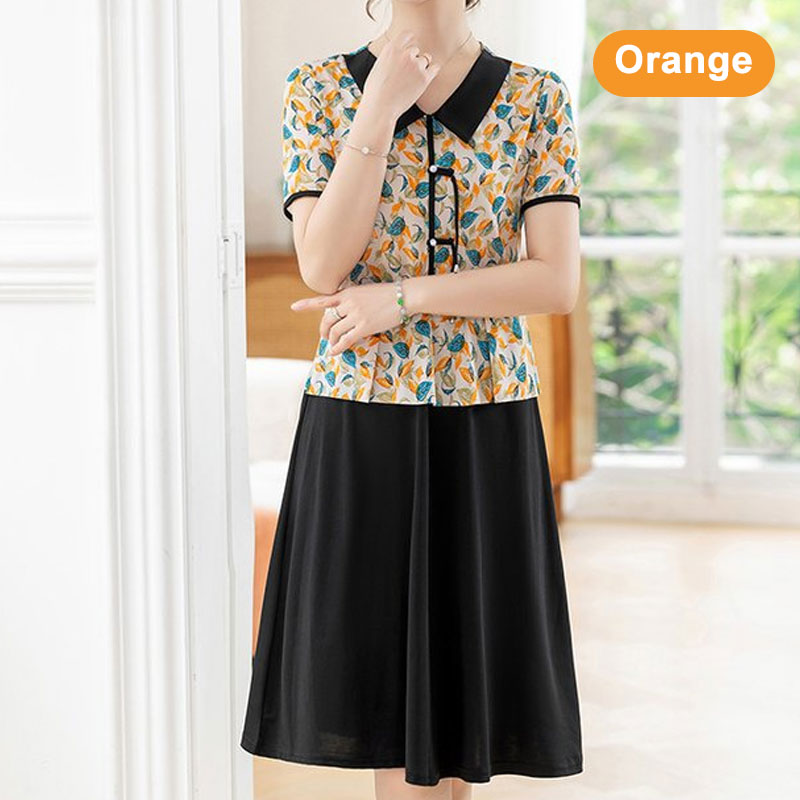 Stylowy, dwuczęściowy wygląd: Panele z kwiatowym nadrukiem tej sukienki płynnie łączą się z solidną czarną podstawą, dając złudzenie szykownego dwuczęściowego wyglądu.