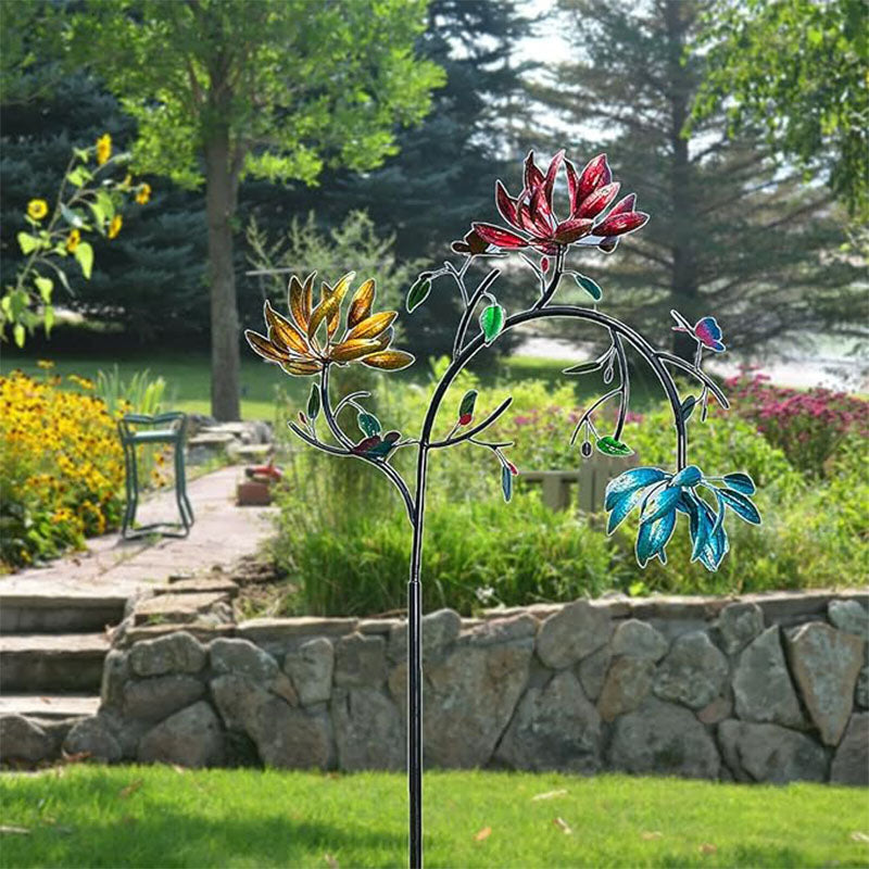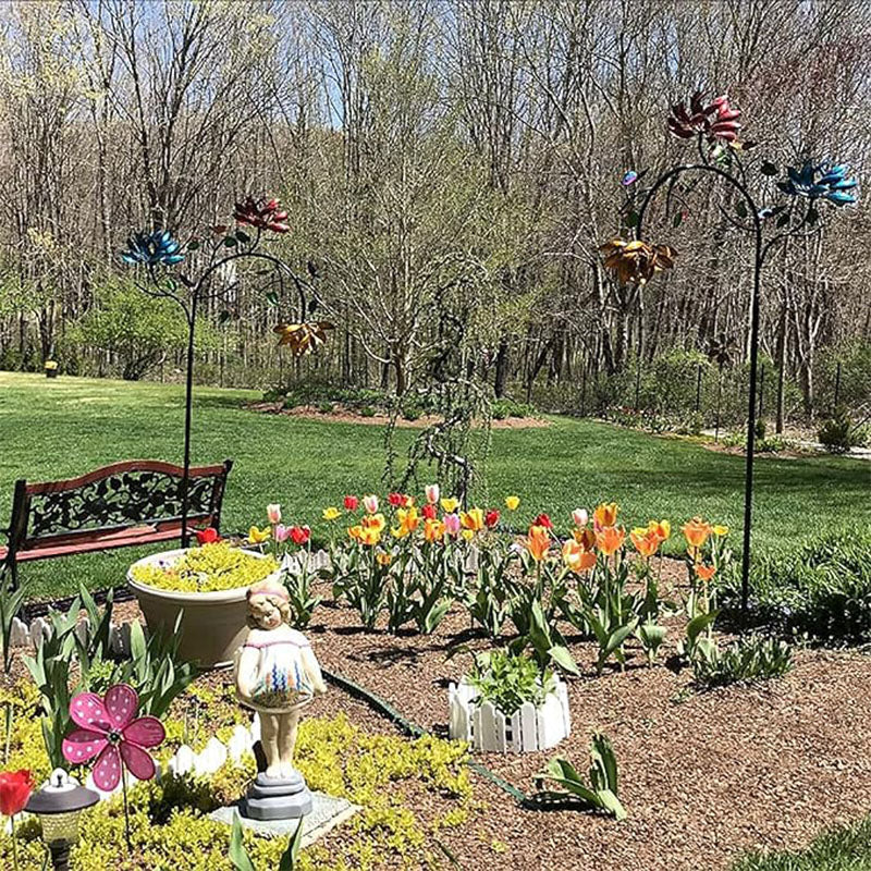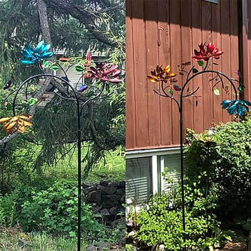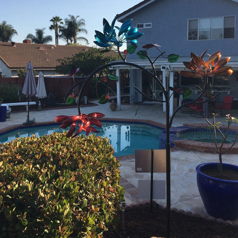 Na zewnątrz możesz podziwiać piękny ruchomy wiatrak z trzypoziomową kaskadą żółtych, różowych i niebieskich kwiatów oraz akcentami w postaci motyli. Przykuwający wzrok, kolorowy wzór kwiatowy porusza się przy każdym podmuchu wiatru.