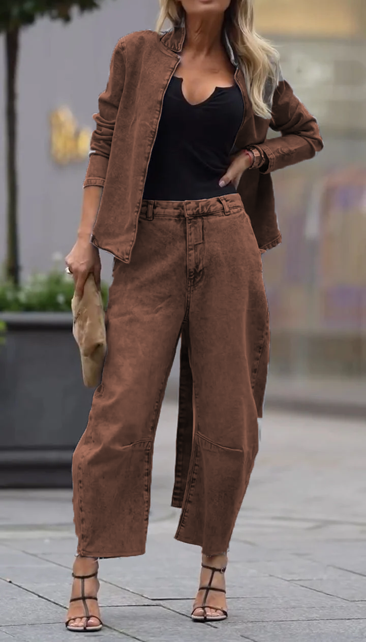 Damski płaszcz z okrągłym dekoltem i spodnie w swobodnym zestawie