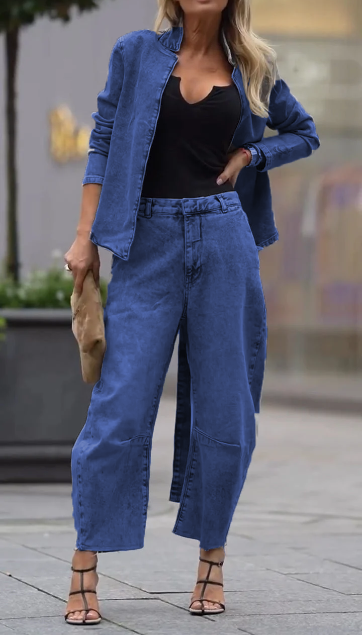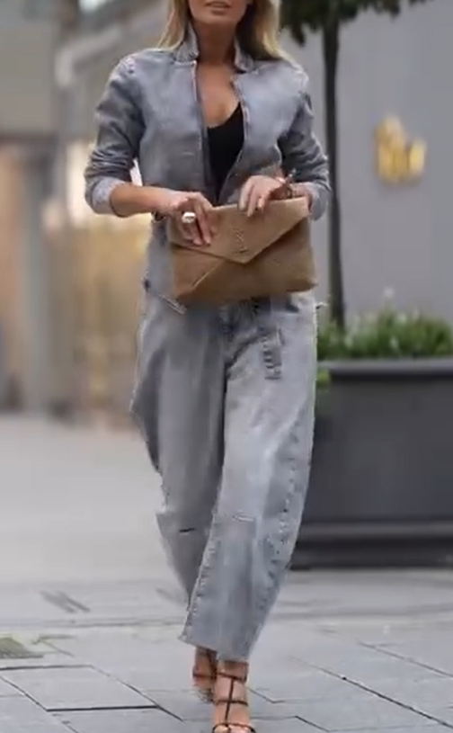 Górną część stanowi kurtka jeansowa o skróconym kroju ze stójką, tworząca wyrazisty, schludny look. Wykonana z wytrzymałego denimu, oferuje elegancką, trwałą fakturę, która zachowuje swój kształt. Ta kurtka jest uniwersalna i nadaje się na wiele okazji. Na nieformalne okazje, załóż ją z prostym, czarnym topem, jak na zdjęciu, aby uzyskać swobodny, a zarazem stylowy wygląd. Świetnie sprawdzi się również jako okrycie wierzchnie wiosną i jesienią, zapewniając ciepło i dodając stylizacji nutę retro i modnego charakteru.