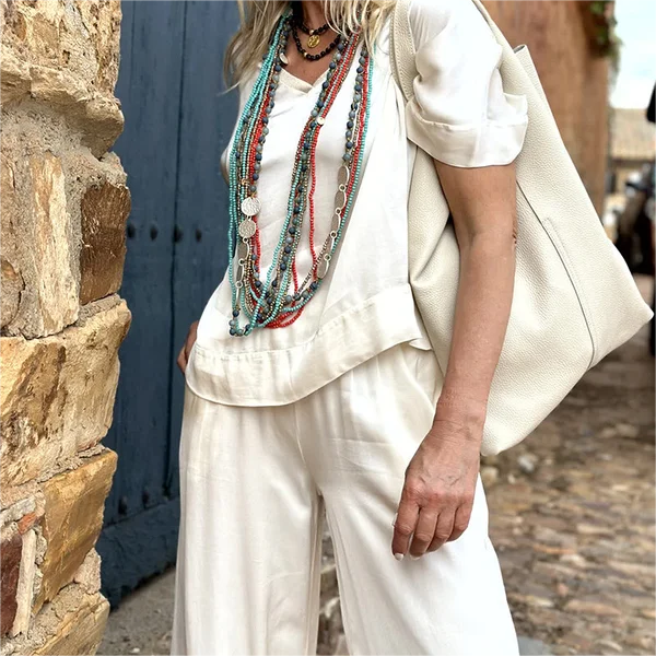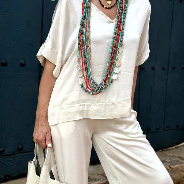 Pakiet zawiera: 1* 2-częściowy zestaw spodni z szerokimi nogawkami, krótkim rękawem i dekoltem w kształcie litery V