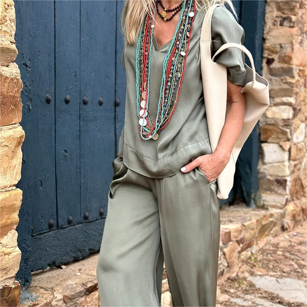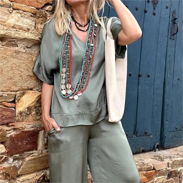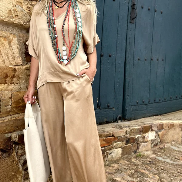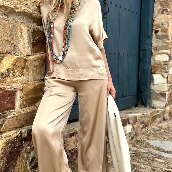 💝Top z krótkim rękawem i szerokimi nogawkami, komplet 2-częściowy✨