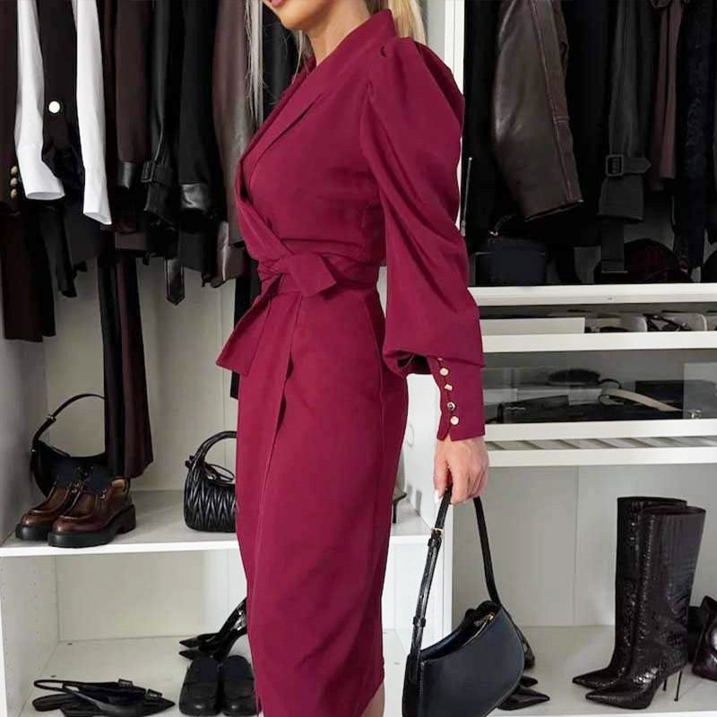 Damska sukienka z długim rękawem i dekoltem w szpic z wiązaniem w talii
