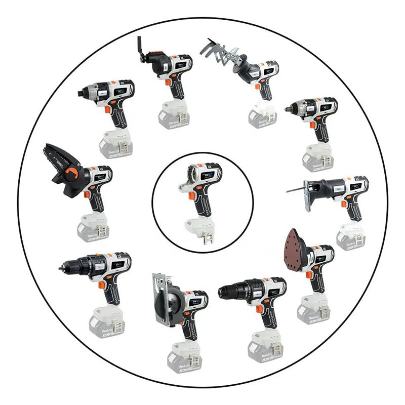 WSZECHSTRONNOŚĆ 10 W 1 - ten zestaw narzędzi zawiera szeroki wybór wymiennych głowic, umożliwiając łatwe wykonywanie wielu zadań. Zawiera różne głowice wiertarskie, brzeszczoty, przystawki do szlifowania i nie tylko, zapewniając wszechstronność potrzebną do różnych projektów majsterkowania i obróbki drewna.